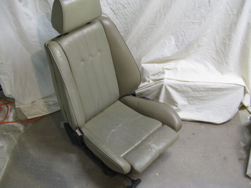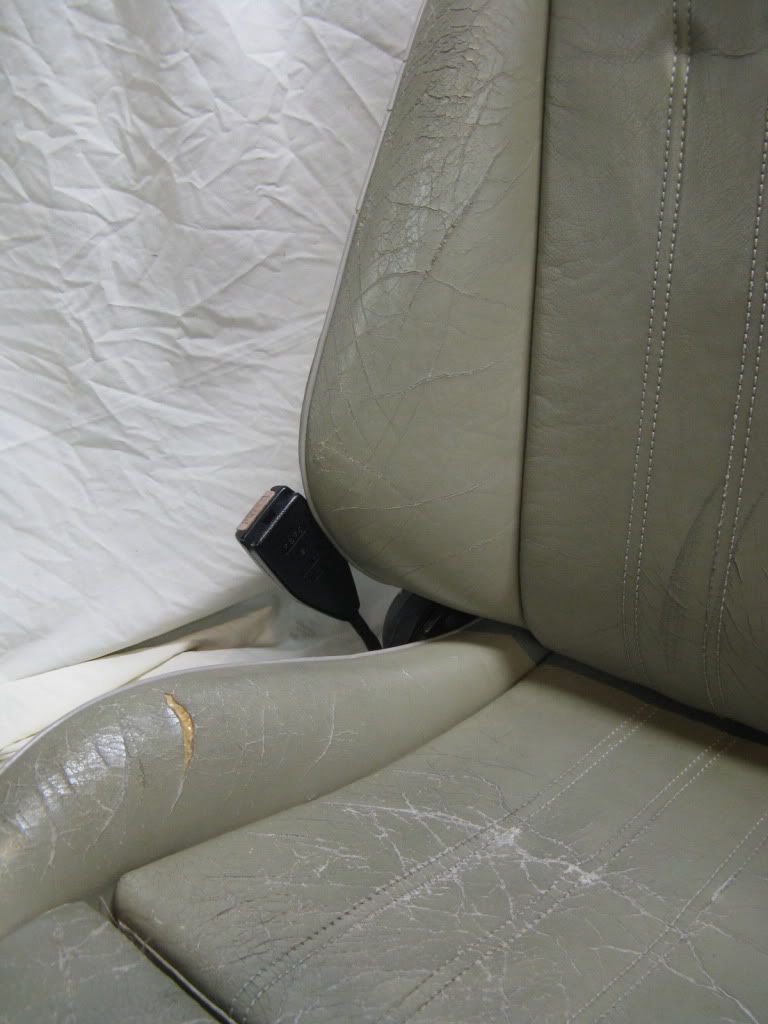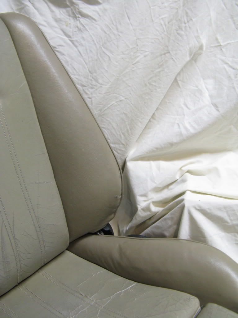 Left side bolsters have been recovered in a slightly off-color tan. Right side bolsters have cracking and one tear, bottom has cracking, back has cracking, headrest is pretty good. All functions work, but shocks are blown.