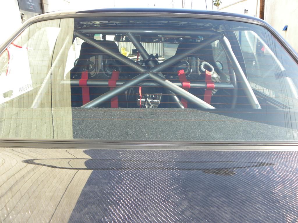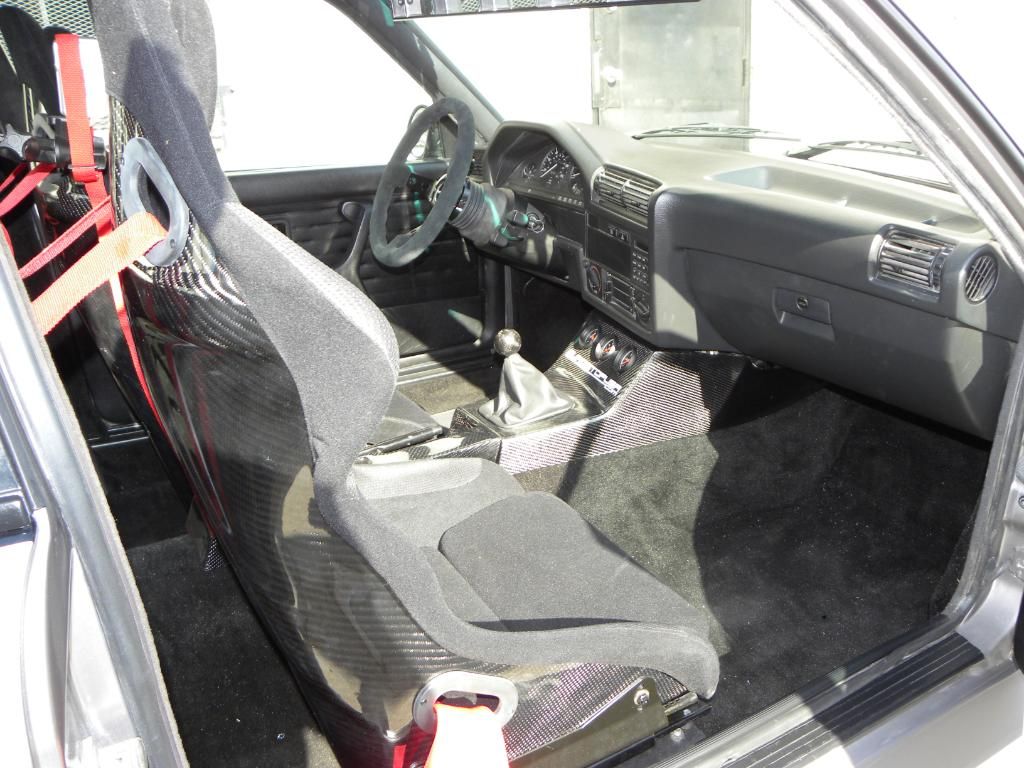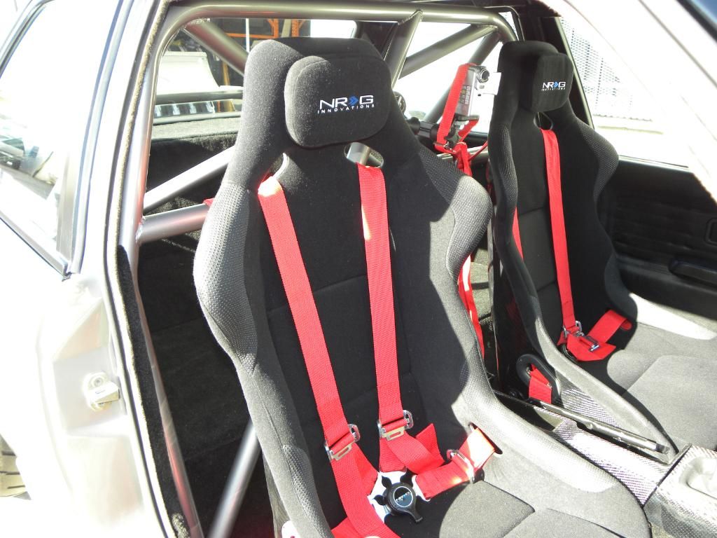 NRG carbon fiber racing seats NRG harnesses NRG carbon fiber shifter Custom 6-point roll cage color matched to car with camera mount DTMFiberWerkz custom carbon fiber center console Autometer gauges
