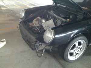 The bad... lost a battle with a concrete support pillar in a parking garage and front pass side got crunched. New fender is attached, but it's gonna need some body work then some fresh paint. The RSR front fiberglass nose piece is repairable, and it is included. The rear main seal leaks and needs to be replaced very soon. The front main seal isn't as bad, but it does leak. Also, rear driver's side took a small knocking and the tail light lens cracked up. The A/C compressor has been removed, so no A/C.