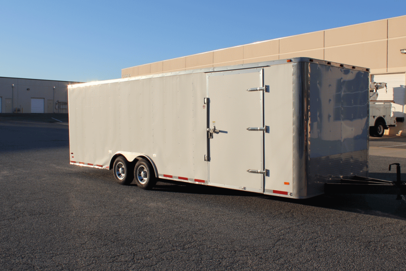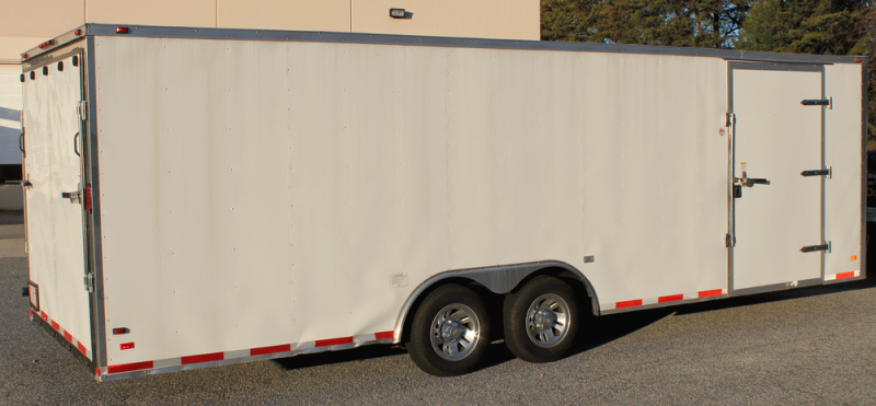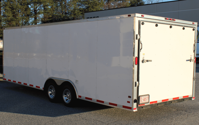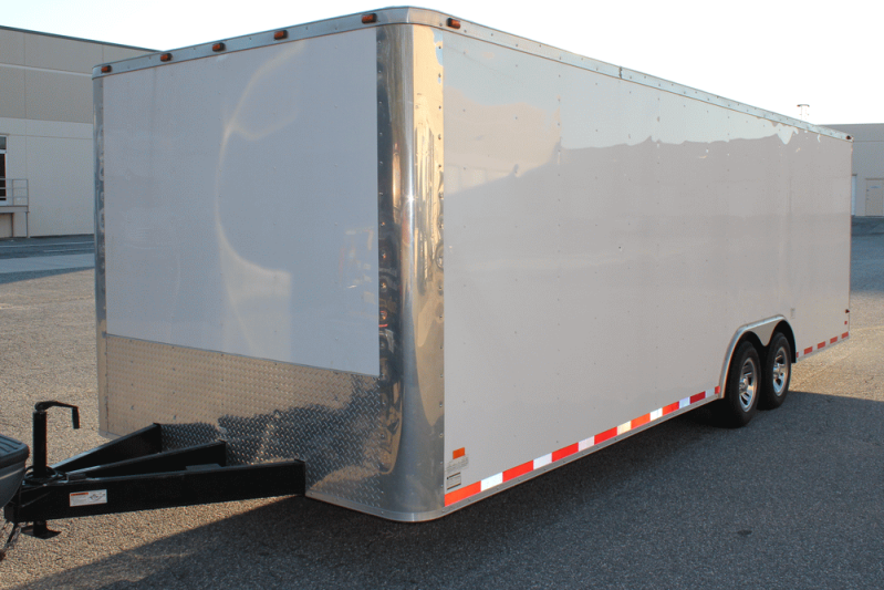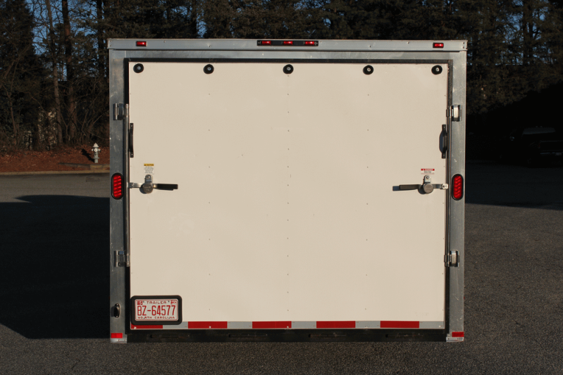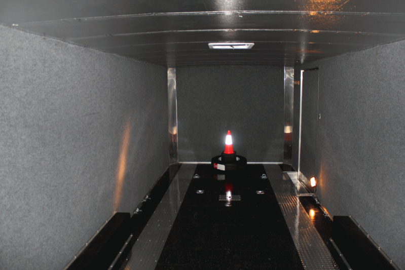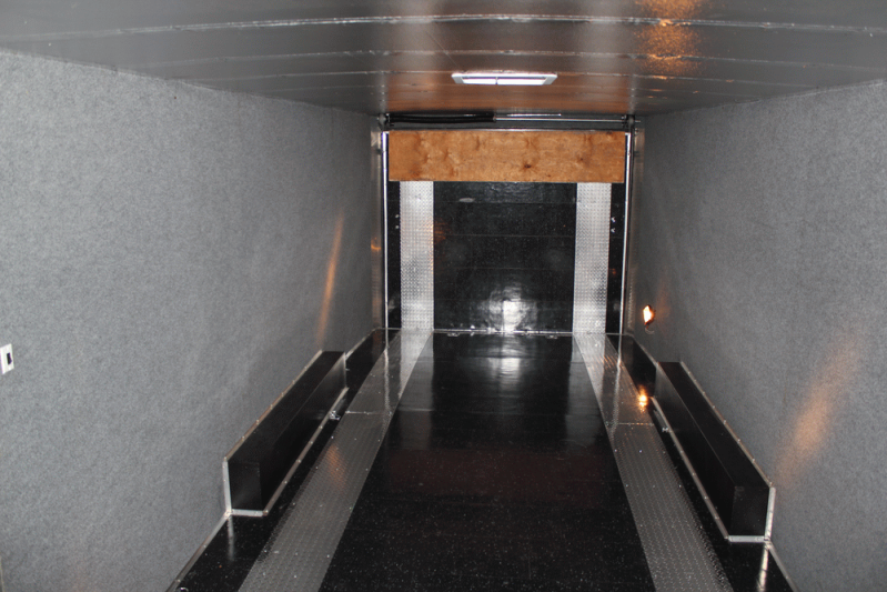 Trailer has all tile floor, with diamond plate steel tracks into the tailer, insulated roof, vent in the ceiling, carpeted walls to keep any doors from hitting the interior walls when you haul your car. The trailer has a max hauling capacity weight of 7,000 lbs, Dual Axle with chrome wheels. It was manufactured by Freedom Trailers. Inside of the trailer has a light switch with two lights, one near the front and one near the end of the trailer that are adjustable so you can see inside if needed.