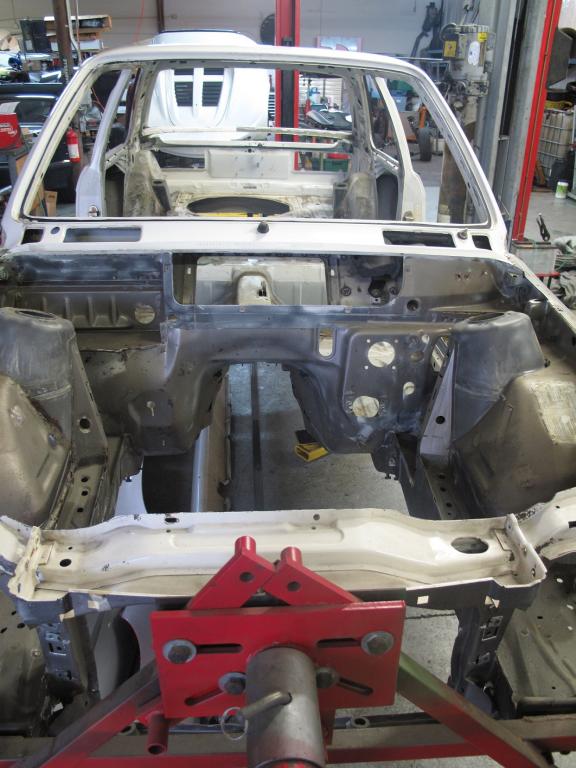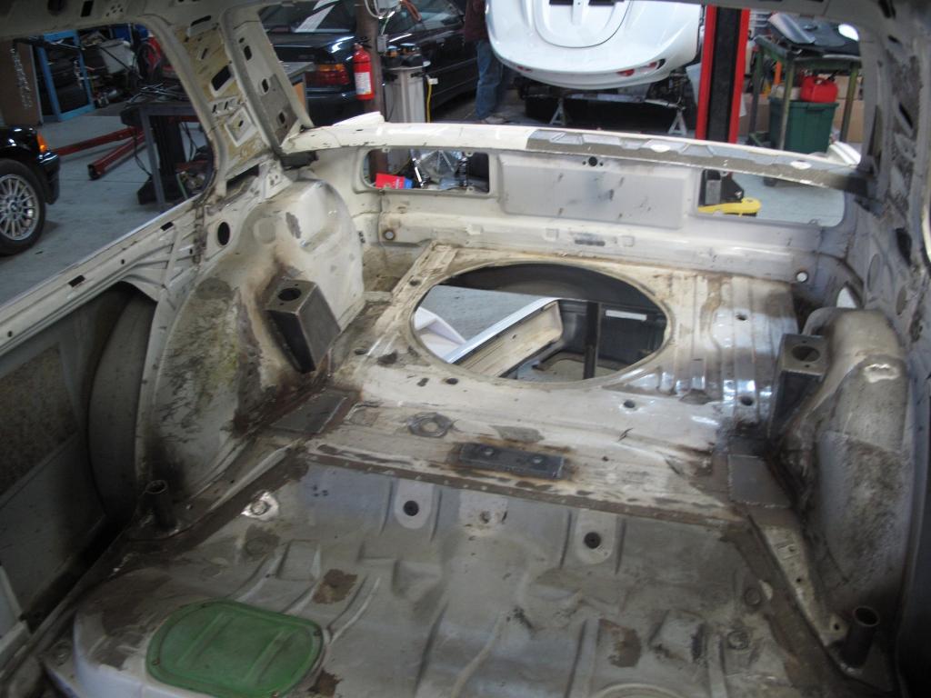 Bottom of shell has been bead blasted, anchor plates have been welded in at various points for a roll cage, rear shock mounts have been boxed in, some lightening has been performed.