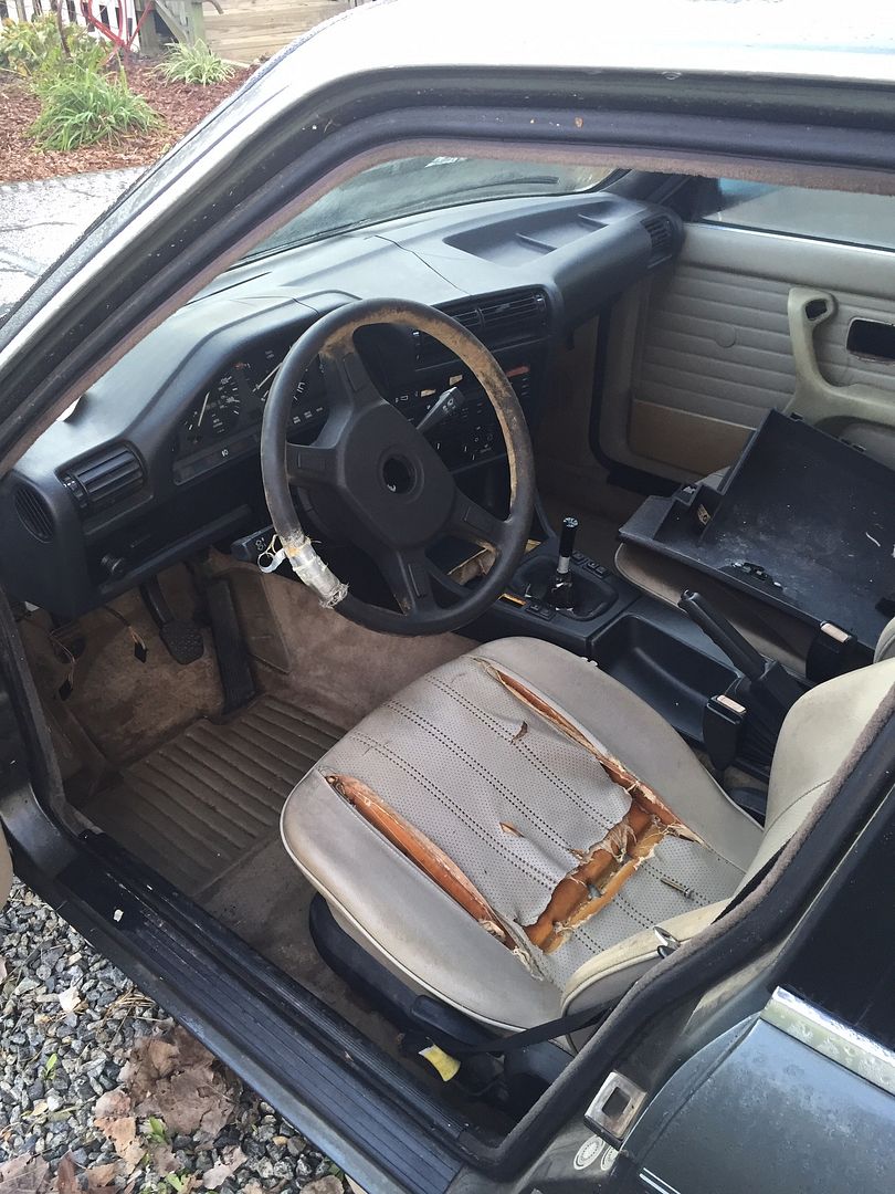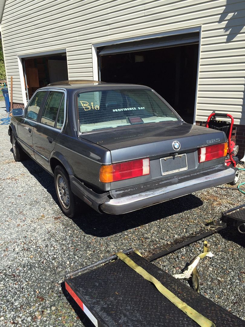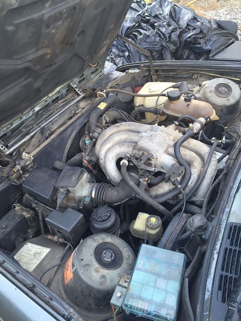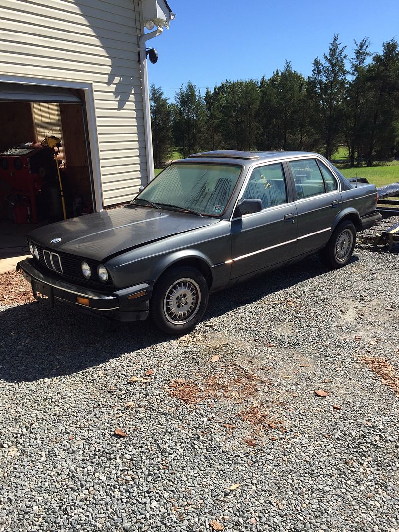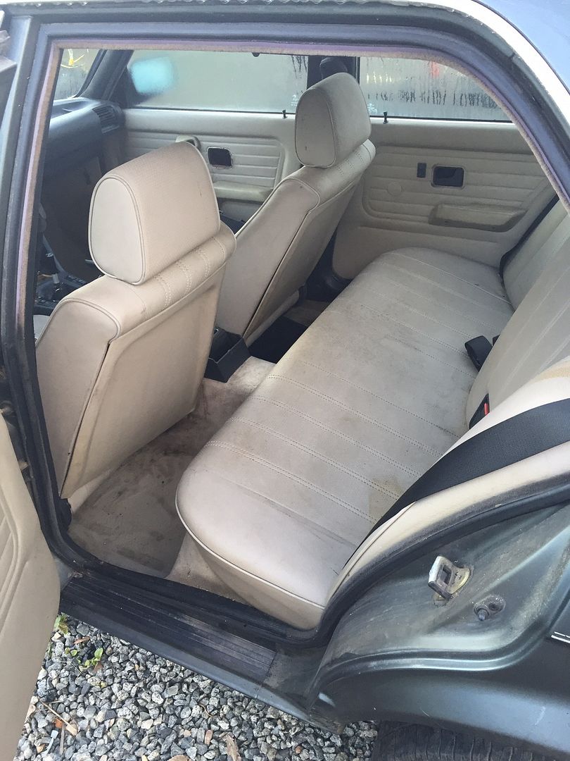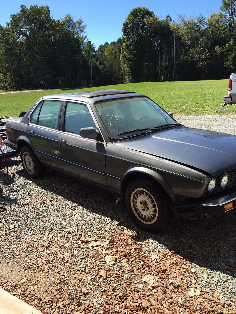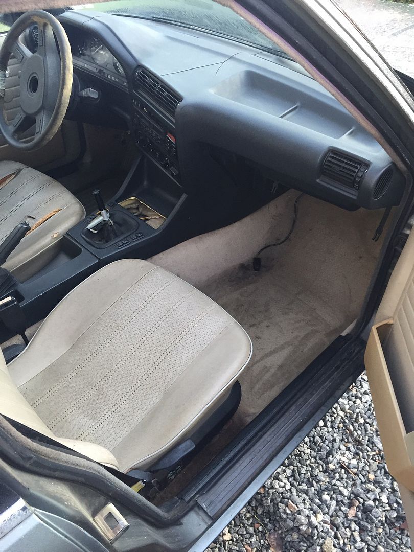1986 E30 sedan. The car has been sitting for about 14 years best I can tell. I purchased it for a few small interior trim pieces (ashtrays, shifter, steering wheel center) and front bumper. I was going to keep it as a parts car but I really don't need anything else as mine is mostly complete now. It ran when parked in 2000. I have not even attempted to turn it over, no battery, old gas, and would need an oil change at least before trying. It is a complete engine though. Body is straight, no rust, fair paint. The interior is tan leather, passenger seat and rear seat are good, drivers has a rip. 3 of 4 tires are good, left rear won't hold air.