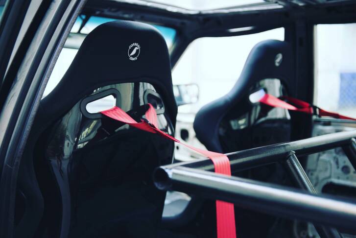 Steel tube harness bar bolted to oem rear seat belt mounts