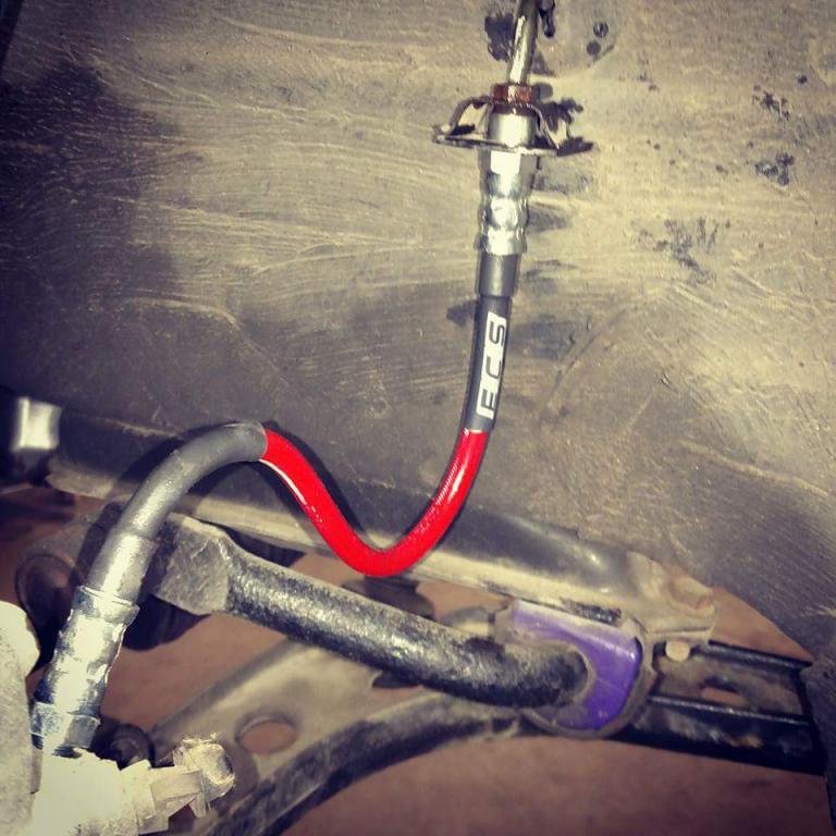 Coolant reservoir relocated to passenger side, with stainless tubing routed from driver's side