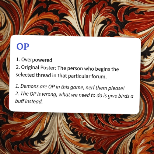 OP: 1. Overpowered 2. Original Poster: The person who begins the selected thread in that particular forum. OP: 1. Overpowered 2. Original Poster: The person who begins the selected thread in that particular forum.