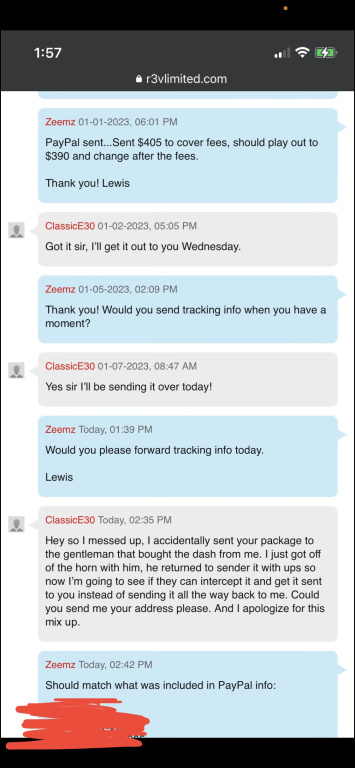 This guy is really good, we made a deal for the dash and center console for $1800, I PayPal him and because he wanted me to cover PayPal fees he issued me a refund, then he posted the carpet and I PayPal him the $2500 he accepted it with no issues, he always responded to all my messages and then he went MIA, I filled a claim with my credit card and they said that I am protected, of course they are going to investigate and contact PayPal, once PayPal can't confirm shipping the case should be closed, my credit card has been credited back pending investigation.