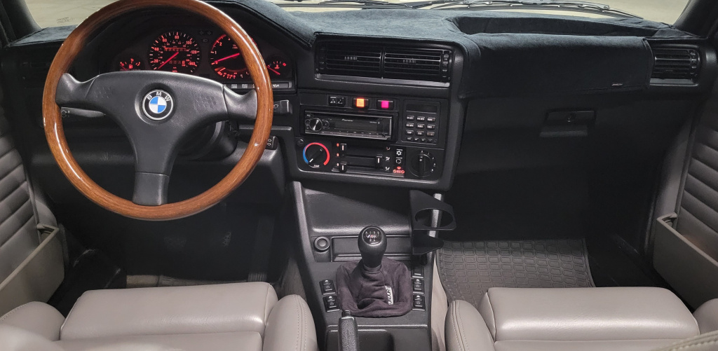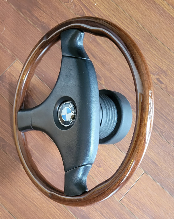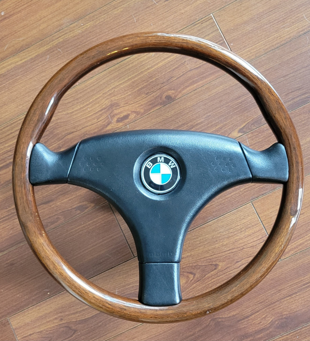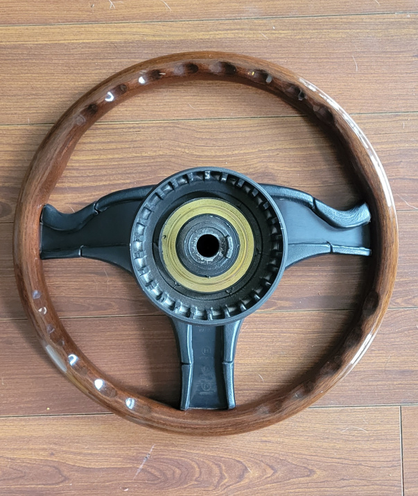 It is a 355mm wheel, with momo black leather wrapped horn button and center in excellent shape. Wood steering wheel has a couple small blemishes, but overall in really good condition (see pictures)