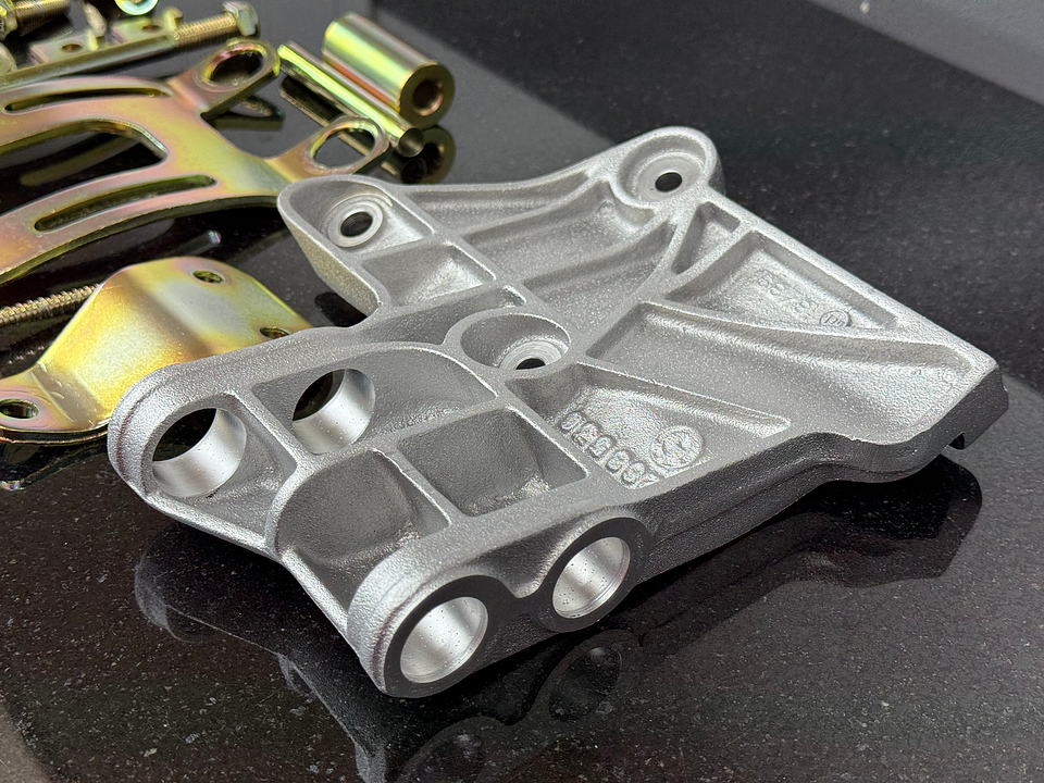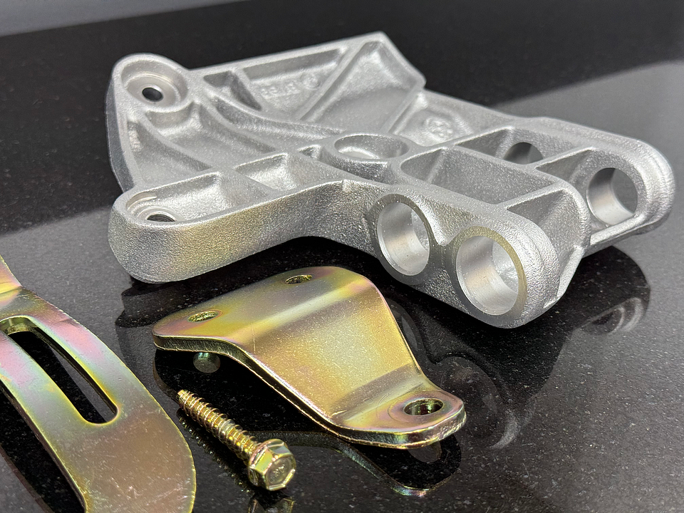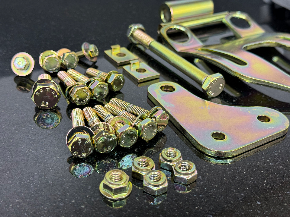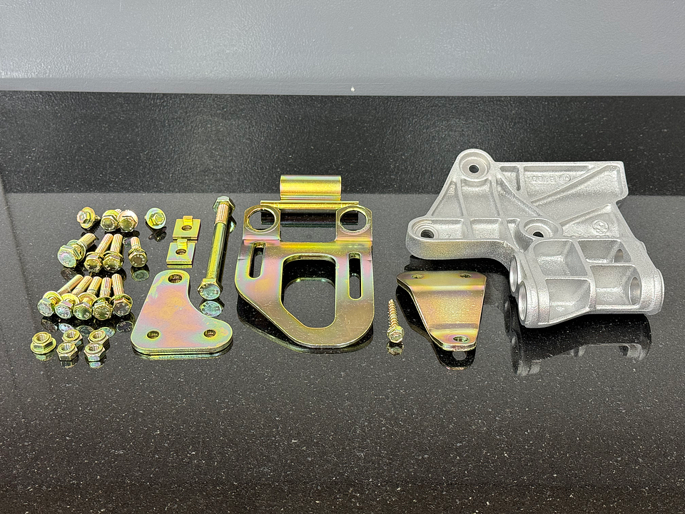 Complete set of bracketry / mounting hardware for the original Bosch wingcell A/C compressor as used when mounting to a S14. Some of this hardware is NLA or Backordered. Everything has been vapor honed, polished and yellow zinc plated as seen to restore it to near new condition in the original zinc finish. What of this hardware is still available comes in the matte grey zinc finish only now.