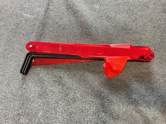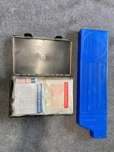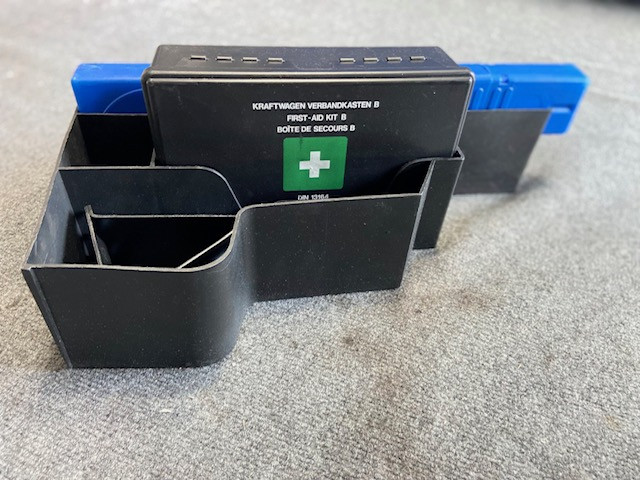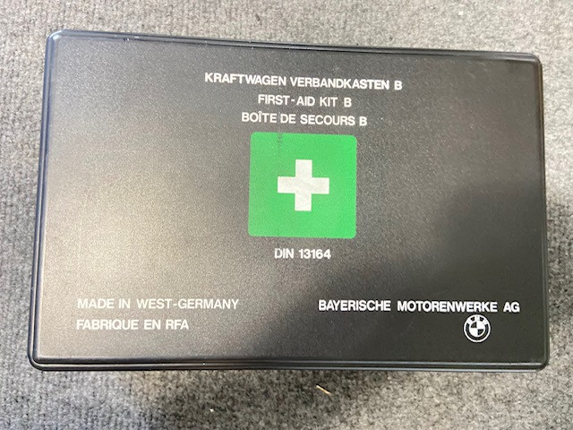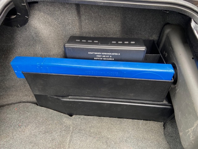 Original euro spec e30 trunk organizer. Fits on top of the battery cover and includes a warning triangle, unopened first aid kit and a wheel chock.