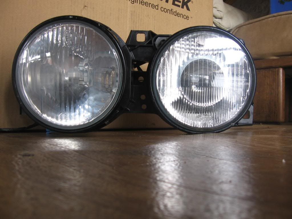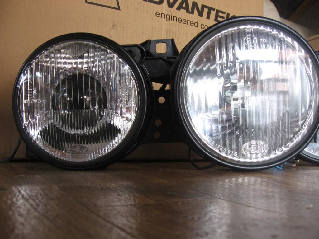 I have another set here for sale. Same as all of the other sets. all of the connectors are there, so you can easily wire these up in ANY E30. All of the adjusters are in good shape, and NOTHING is broken. These are original Hella lights, just at a 1/3 of the price. The light output is improved over the U.S. sealed beams, as well as the u.s. ellips. the beam pattern of the euro lights has a directional cutoff, allowing the light to be aimed a bit higher and still not blind oncommming traffic.
