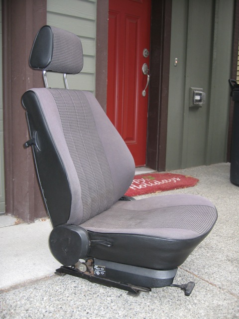 gray/black hounds-tooth driver seat, not a sport seat. no rips or tears. i'd give it an 8/10.