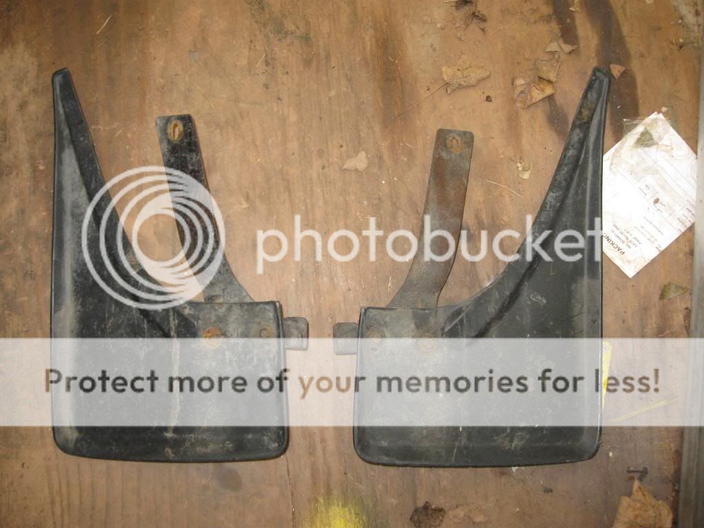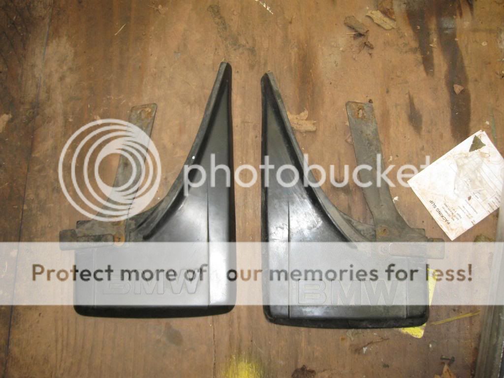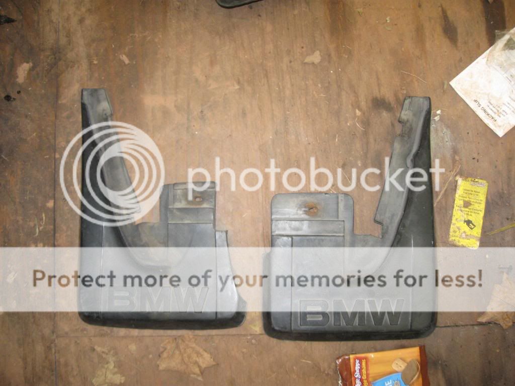 I have a nice set of late model mudflaps (with the BMW logo on them). The flaps themselves are in great shape and includes the brackets. They'll probably need new hareware as some of it is missing but I'll include what I have. There's a small tear in the corner of one of the flaps but besides that the rest are perfect, albeit a bit dirty.