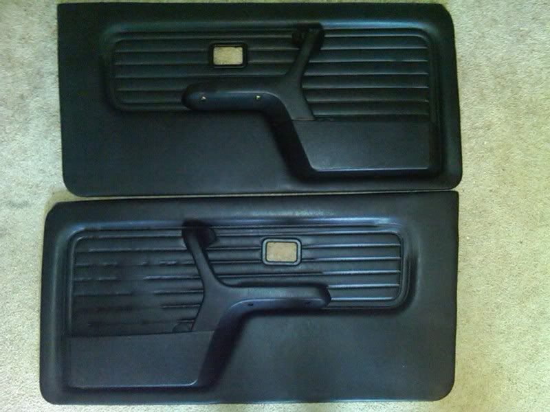 Black vinyl door cards in good shape. Vinyl is slightly pulled away from backing on passenger's side. No cracks anywhere.