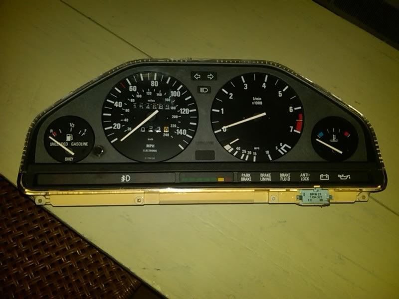MotoMeter cluster from a '91 318. Upper A-arm mounting brackets are broken, and water temp needle broken (not visible in pic, but when I took the cluster apart to inspect it, it fell right off). Good for parts - will sell outright, or part out what you need. Odometer works (currently on 154,688) as well as everything else AFAIK.