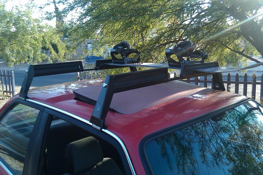 I bought this used awhile back but never have had the time to make it anywhere that it snows. Now I'm on the lookout for a Thule 300 rack so I can carry my bike around as well. It is a universal gutter mount system, I've had it on a 240z, 1959 Volvo PV544, and the e30. It holds two snowboards or up to 6 pairs of skis. Depending on your binding setup you might be able to fit 4 boards. Anyways $80 shipped