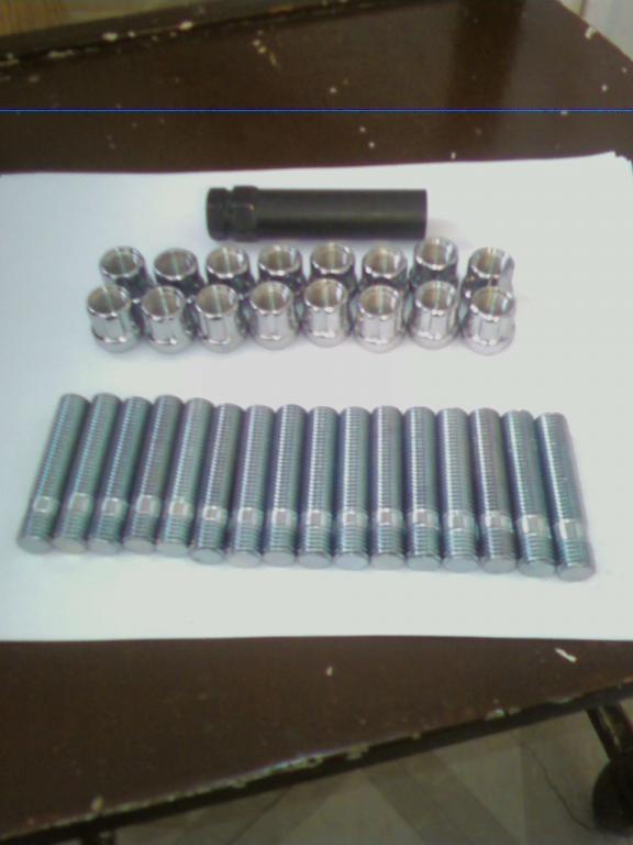 Full set of studs for E30. 16- 60mm long studs, 16- tuner style nuts, socket for the nuts. Brand new, never installed.