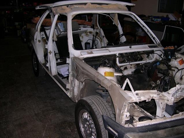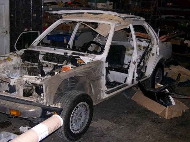 87 325i 4dr shell (alpinweiss). This is a roller but all panels have been removed. It still has the steering column, 5 spd pedals, fuel tank, front and rear suspension, brake system and more.