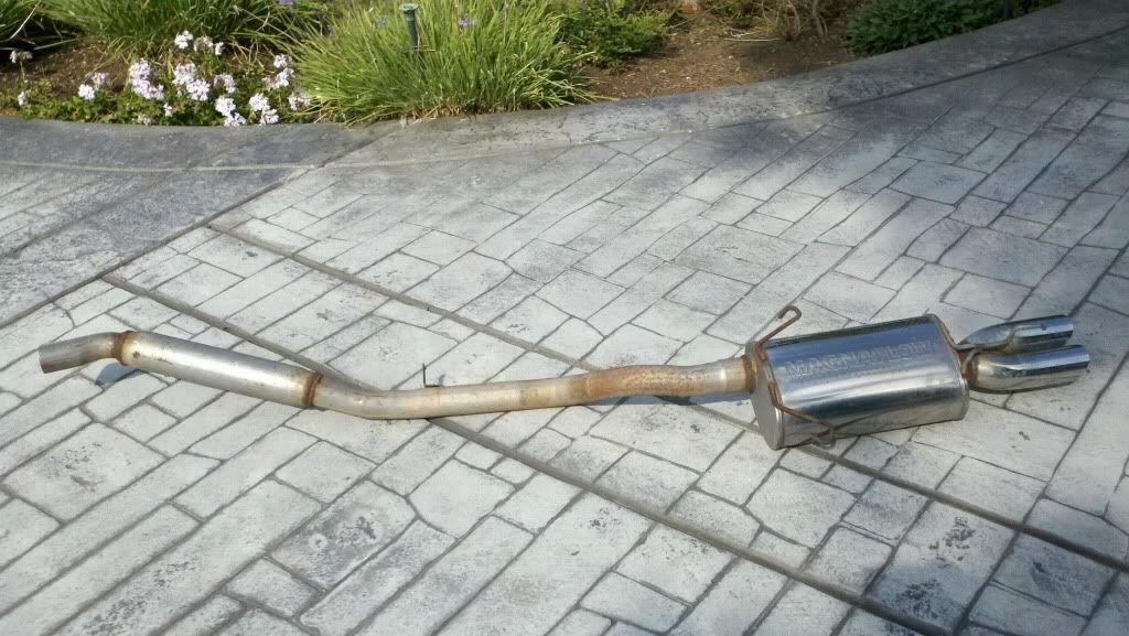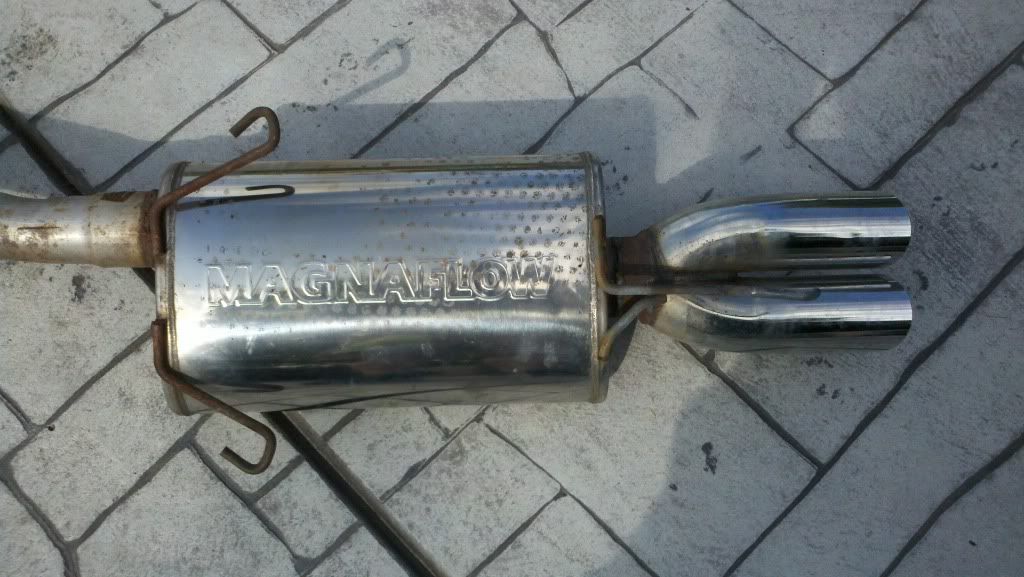 Has a magnaflow resonator and magnaflow muffler, aggressive sounding yet not too loud.