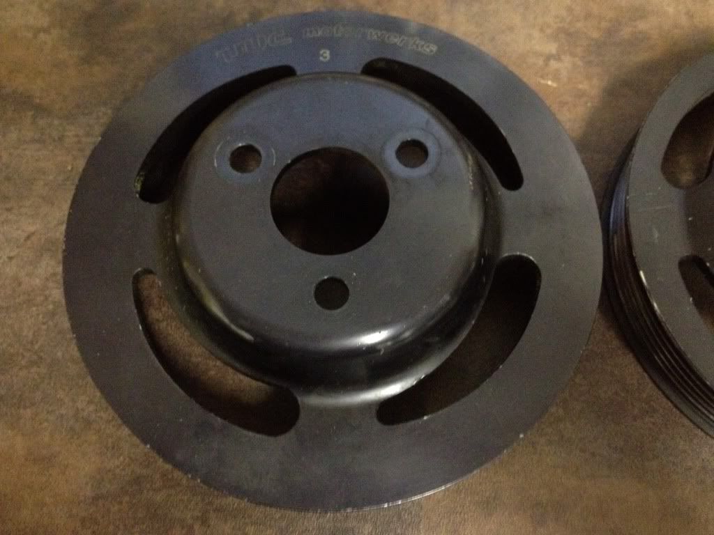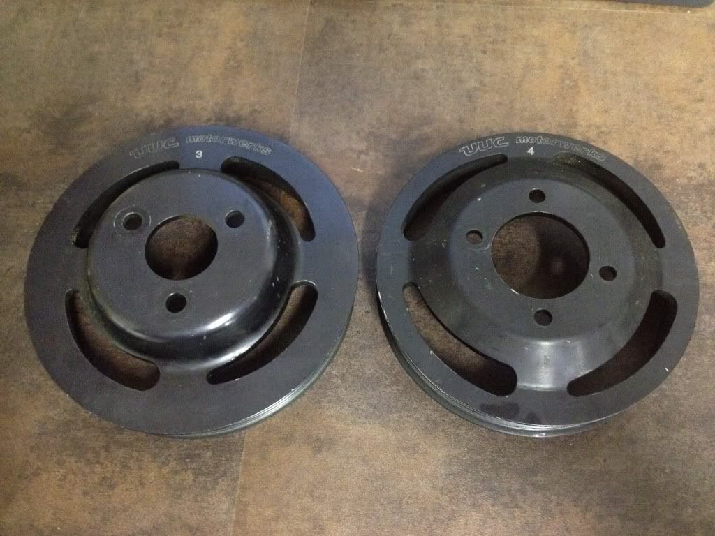 Up for sale is a set of UUC Underdrive pullies that I recently bought. The pulleys are in used but good condition, the previous owner said they were used on his E36 M3. When I tried to install them on my E30, the P/S pulley was not compatible with the pump I have, so therefore they are back up for sale. I believe these will fit OBD1 24V motors (but I'm really not sure as they didn't fit my car), the pullies are labeled numbers 3 and 4, I have contacted UUC and I will update the posting if they are able to tell me the exact application. I will include a brand new properly sized belt for use with these pulleys that will ship straight to you. Price for these pullies with a brand new belt is $140 shipped.