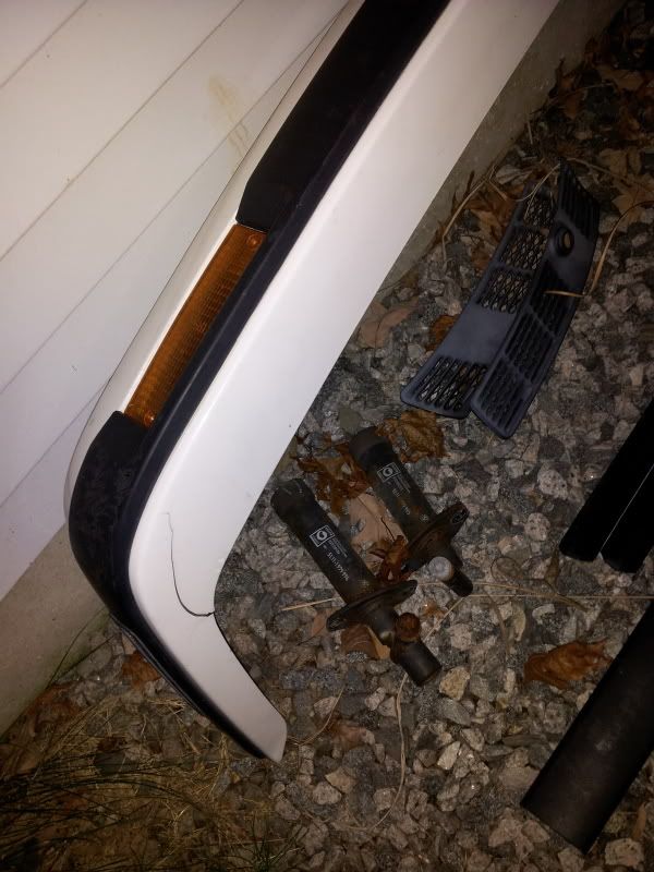 Front plastic bumper in very nice shape minus a hairline crack that when pushed together disappears so it should be an easy fix. Comes with the marker lights, turn signals, front trim, shocks, torx bolts. $80