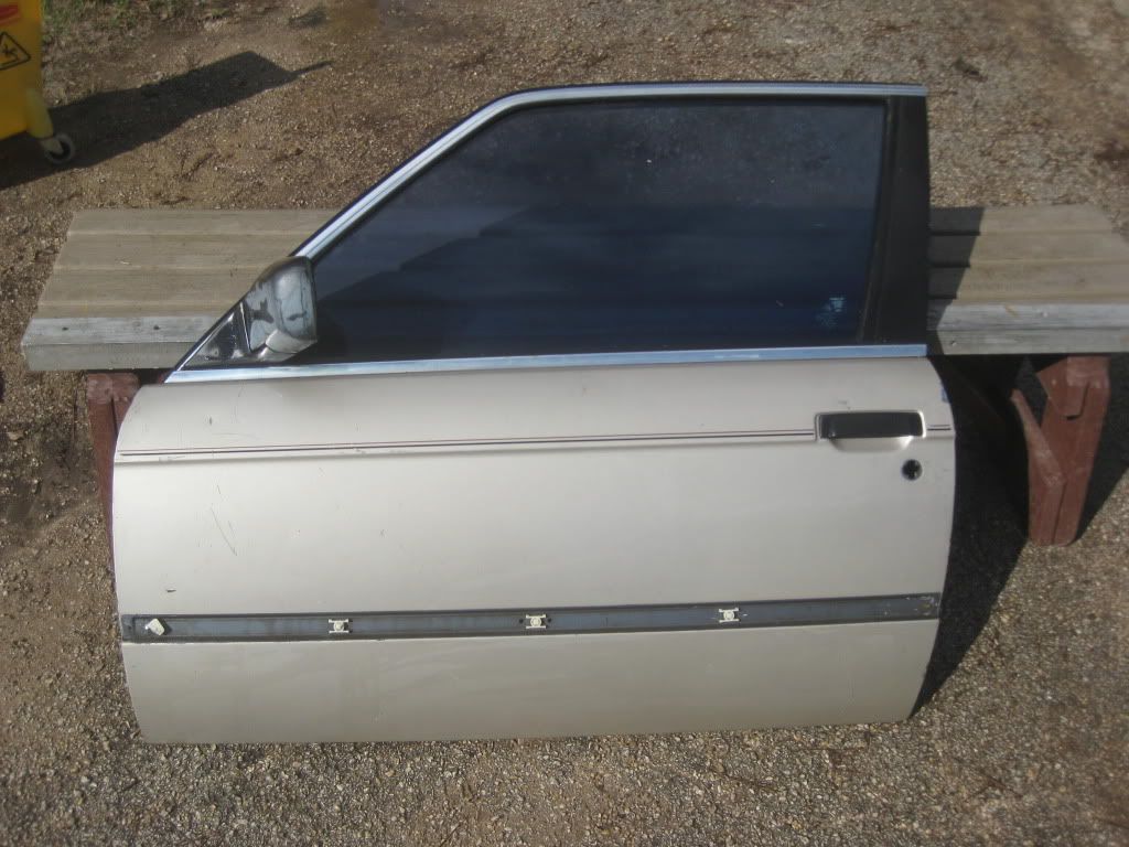 Driver's side door for a coupe. With glass, crank handle and manual mirror. No interior panel. Some rust around the edges.