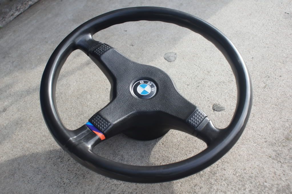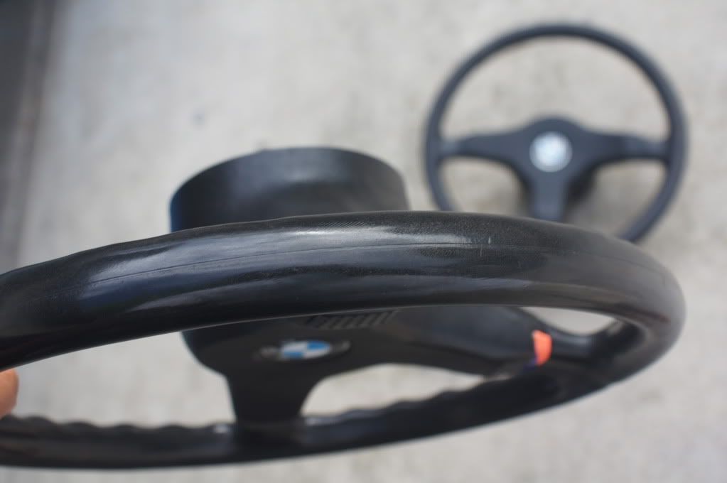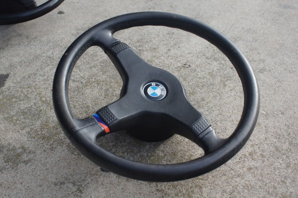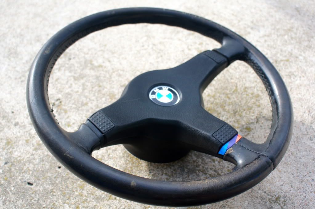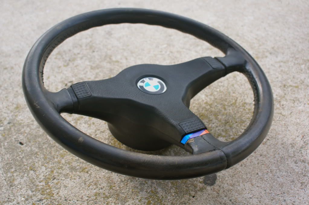 I have two M-tech1 steering wheels both with brand new M striped logos. I stripped the leather completely off of one and for the other, the leather is broken in properly but could use a dye job. If you want it redone add $15 to the price. $100 shipped for the left one (see last image) and $60 shipped for the leather wrapped wheel.
