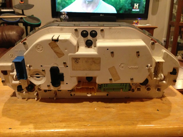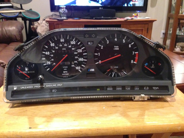Cluster with new odometer gears. Has a very very small crack on the clear plastic cover just right of the temp gauge. Wouldnt even be noticable with the bezel installed