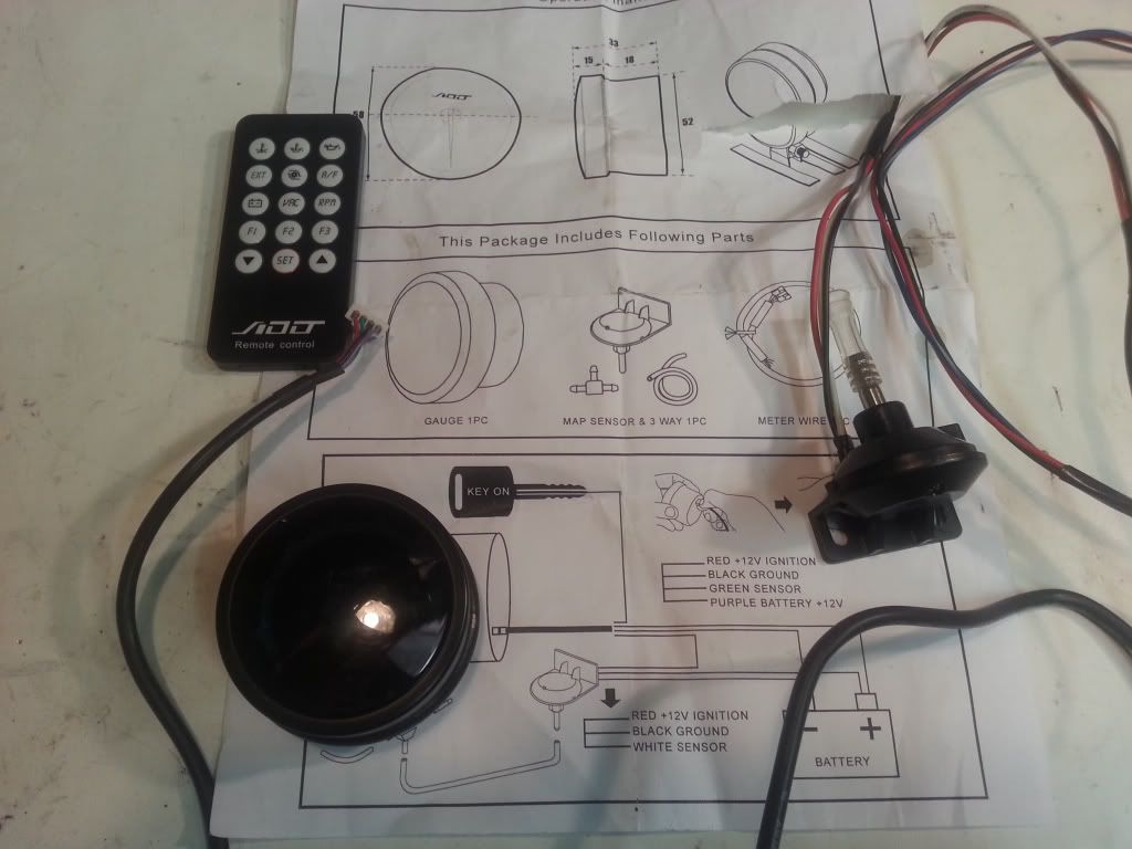 Pictured above is an electric 30 psi boost vacuum gauge. The remote is used to recall your max boost, which is very cool. Make me an offer.