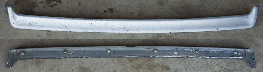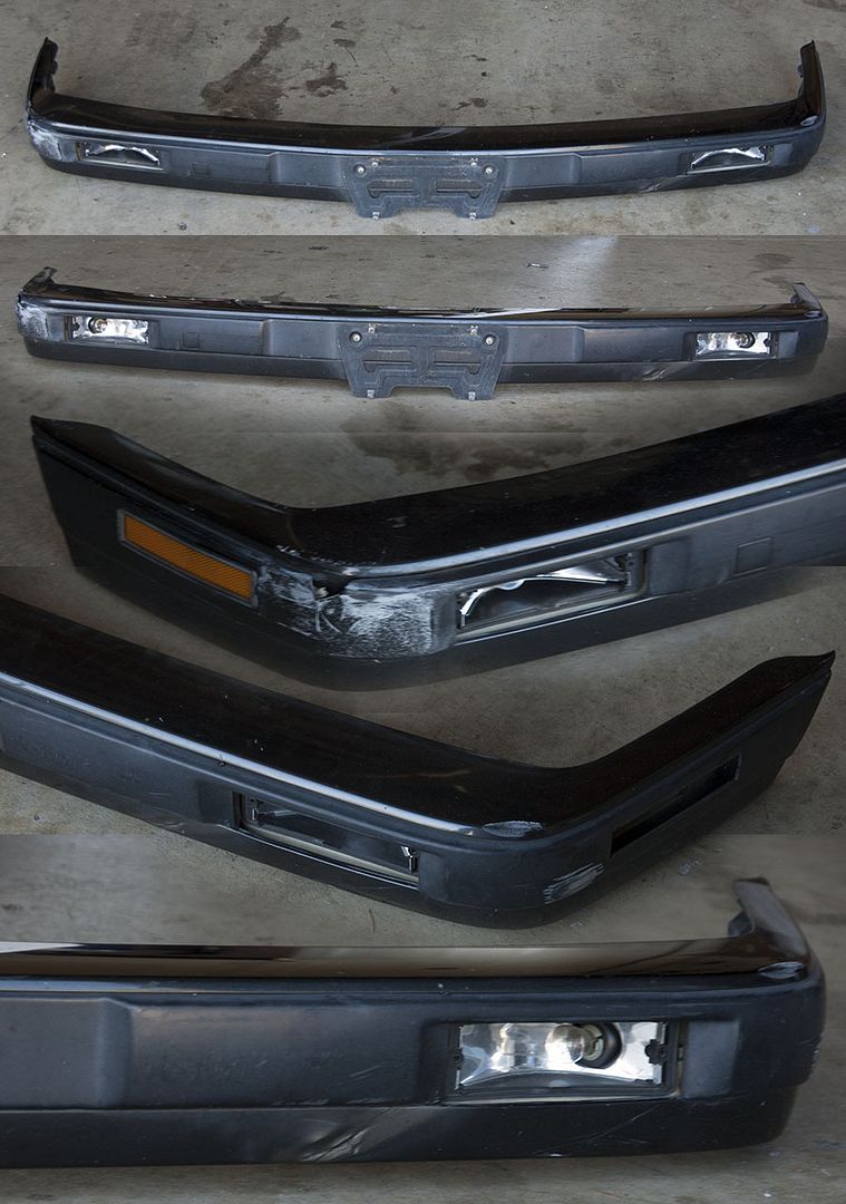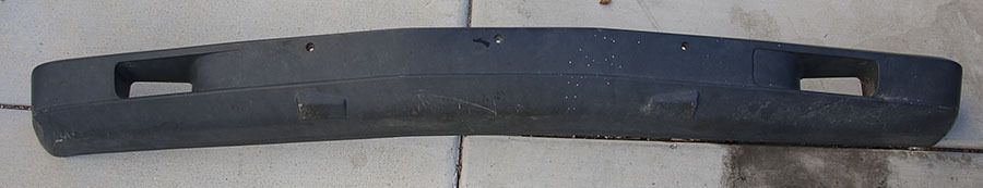 Black plastic front bumper, pretty beat up but it mounts perfectly and is straight, no turn signal lenses and missing one sidemarker, shocks are included but not shown. $40 picked up.