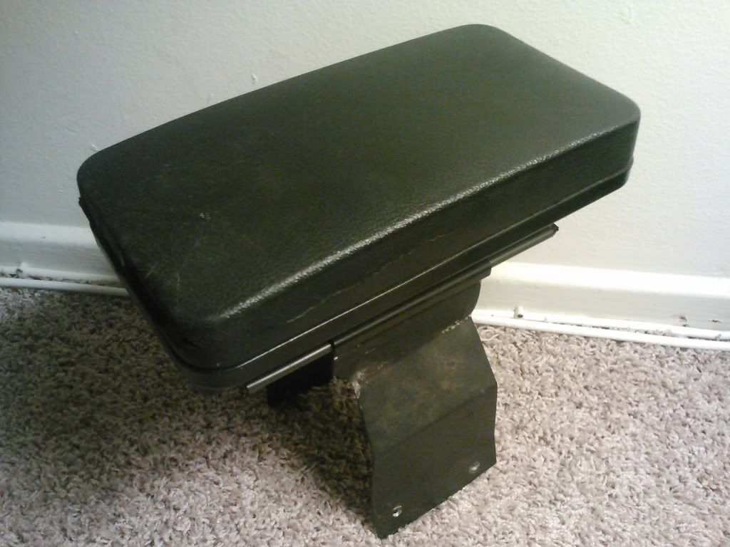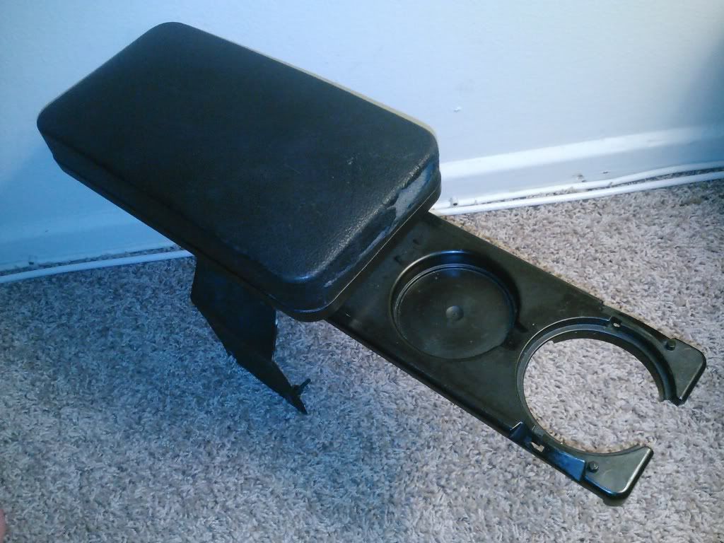 Husco armrest with cupholder. has some wear and tear with an imperfection in the elbow area, but holds firm and steady. Includes screws.