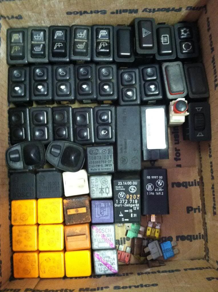 Box of mixed buttons, relays and more $35 whole box Picked Up