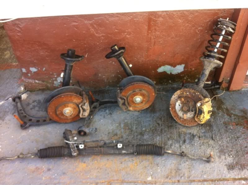 these are off my parts car. calipers are girling and functional. Strut housings are good for coilover conversions. ignore the control arms, they're trash, thats just how i took them off the car. The strut housings without springs are a complete driver and passenger side, the one with a spring is a drivers side.