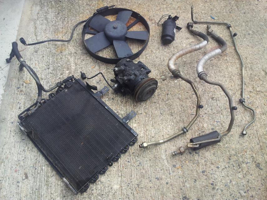 I'm selling some of the air conditioning components from my e30. I DO NOT know if the compressor is good (I never had the A/C operational in my car) Because of this, I don't even know what it's all worth, so shoot me offers if you're interested. I'll part it out (send an offer) otherwise I'm asking $50 for everything in the picture, the condensor, the electric fan, the compressor, the dryer, and the two lines. The third line was pulled from a junkyard car, and has a built in fuel cooler which is bitchin' but neither of those lines have the right fitting size for the compressor.