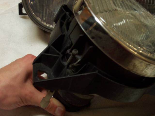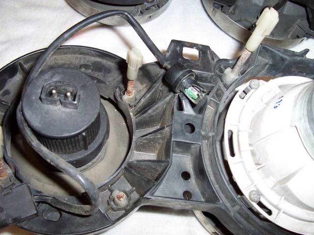 Passenger side has a bracket broken where the adjuster screws in, as in the picture. Also has some pitting on the high beam. There is also pitting where the 5 watt city light used to be on the passenger side. The city light holder is slightly damaged, but believe it can still hold the bulb in. I do not have a replacement.