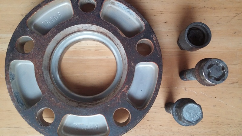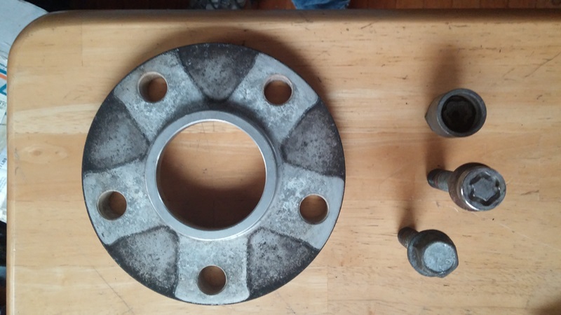 2. 5 lug 18mm E28 wheel spacers with extra length locking lug nuts and key $75.00 SOLD