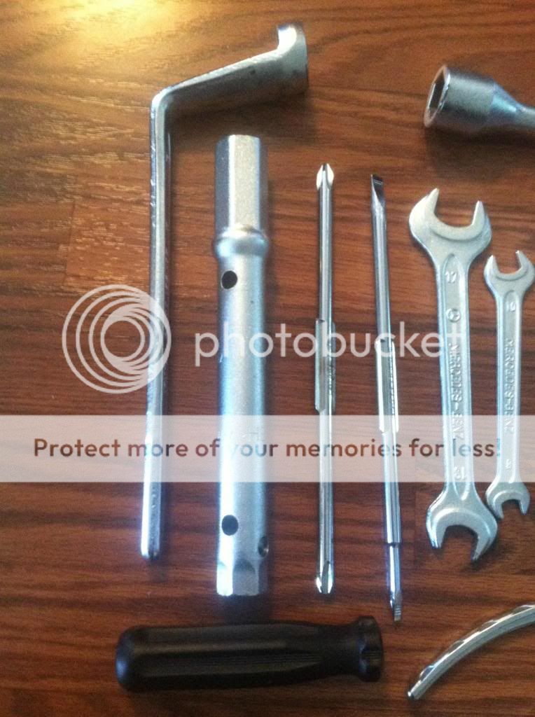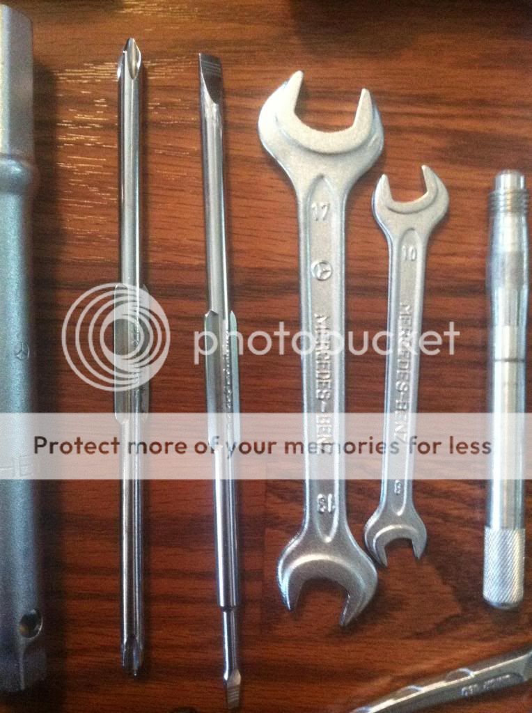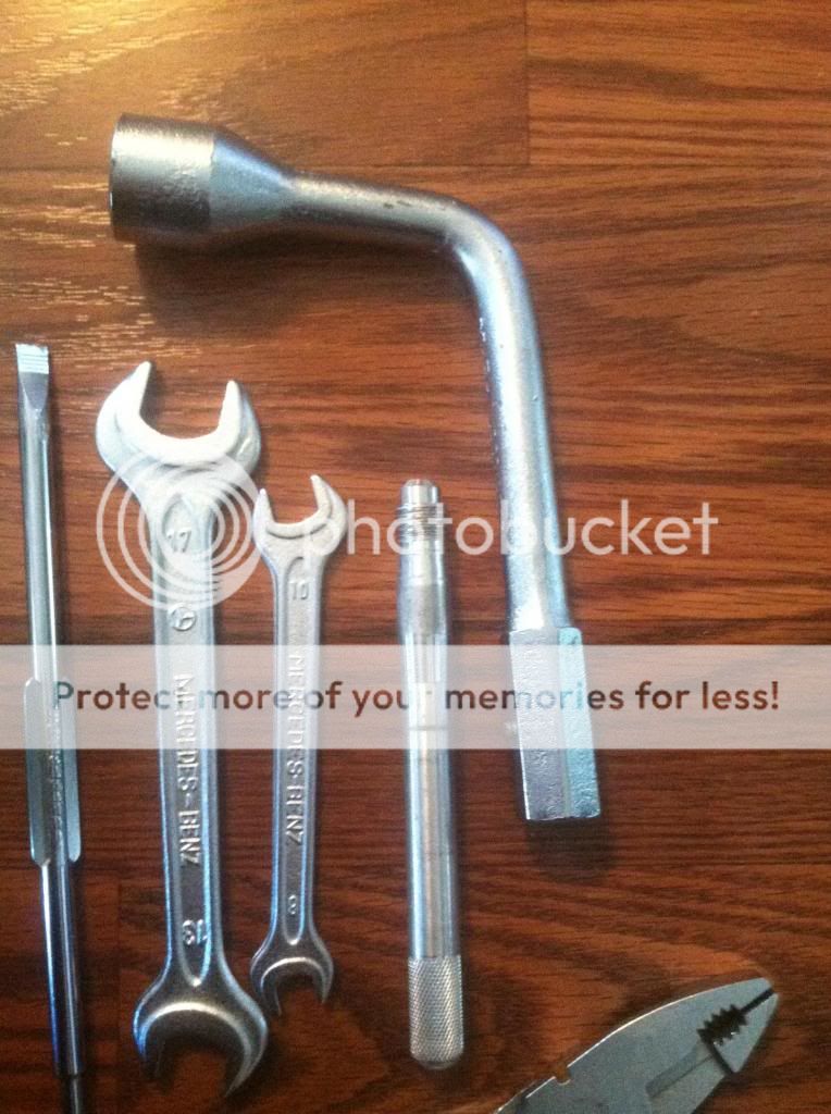This is a set of tools from what I think was a Mercedes 300e. I don't remember the exact year though. From what I've looked up it is the complete tool kit that comes with the car besides the red carrying bag. They have very little use if any at all.