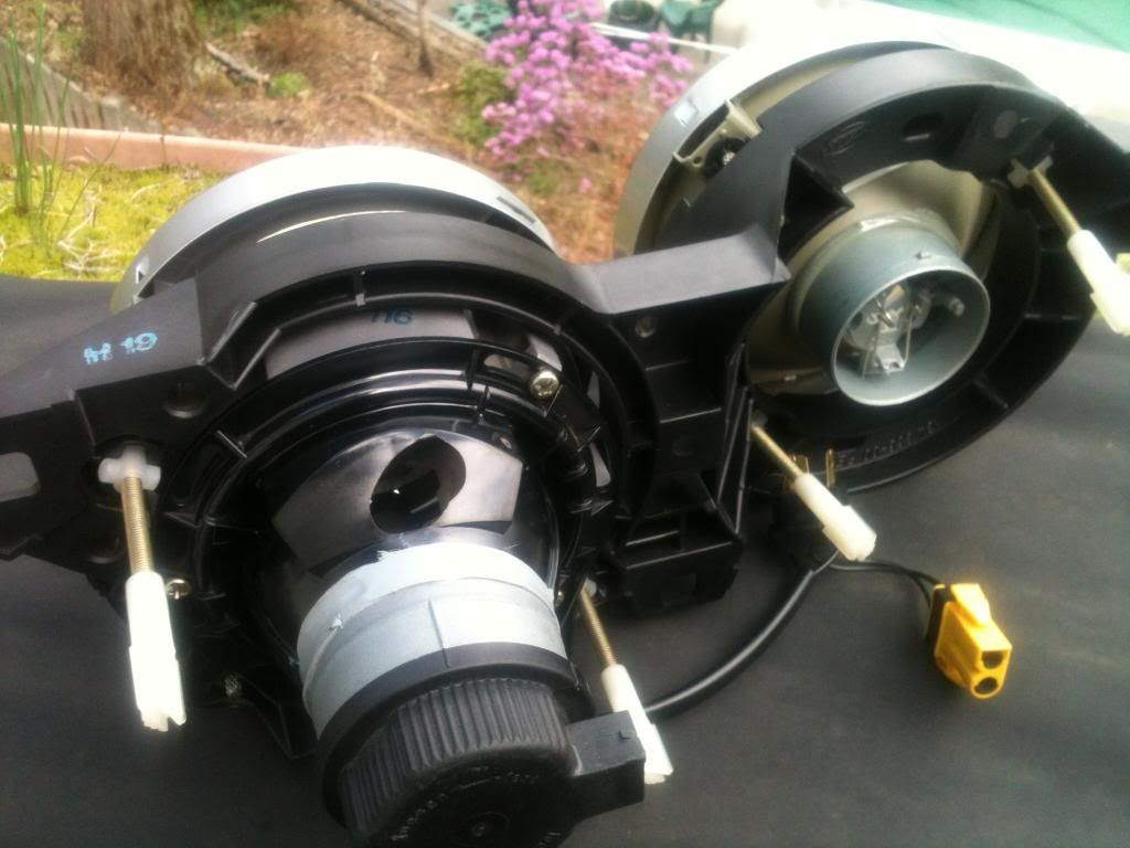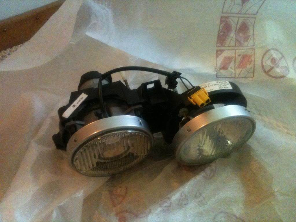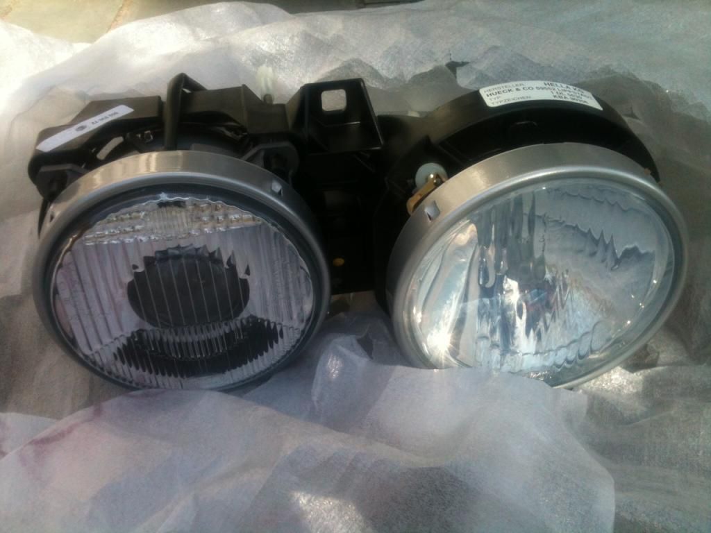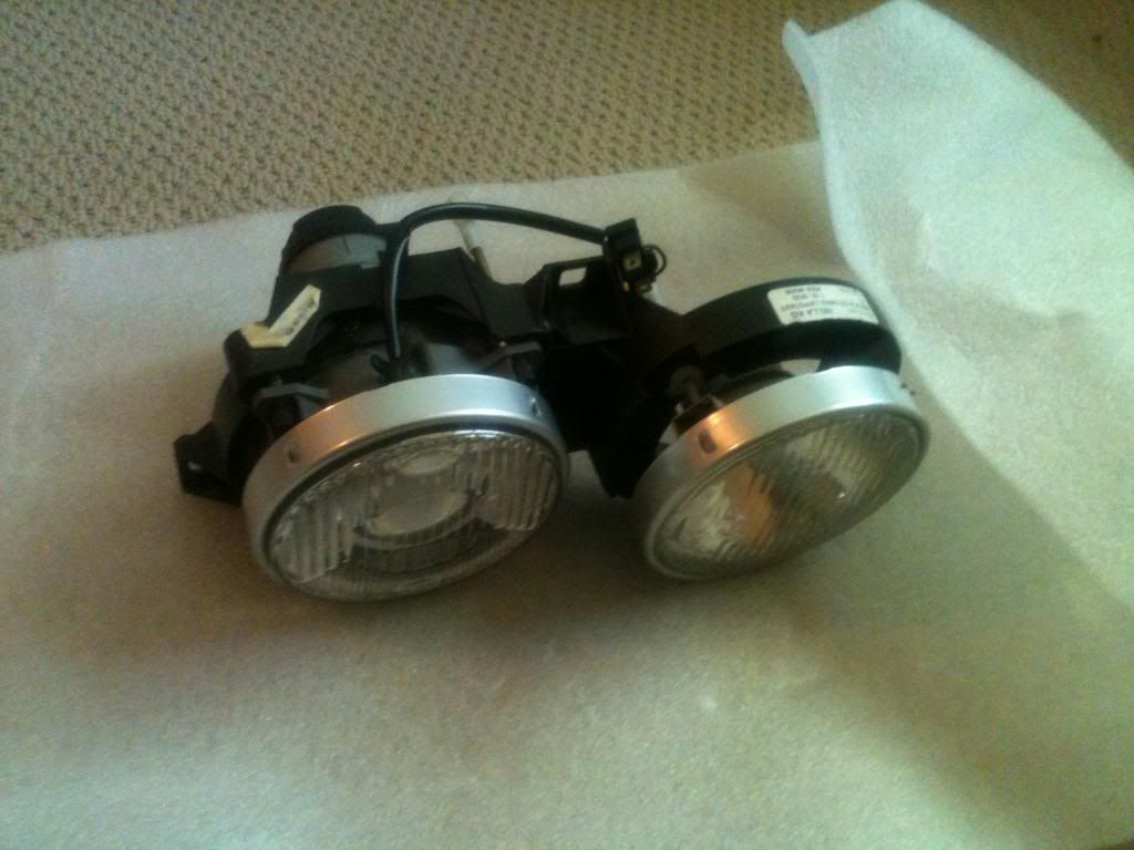 New with light damage. One lens is milky. One low beam has a chip, so it lets some light out. Tested at night and the beam is undisturbed. One low beam reflector(not lens) is chipped. SOLD