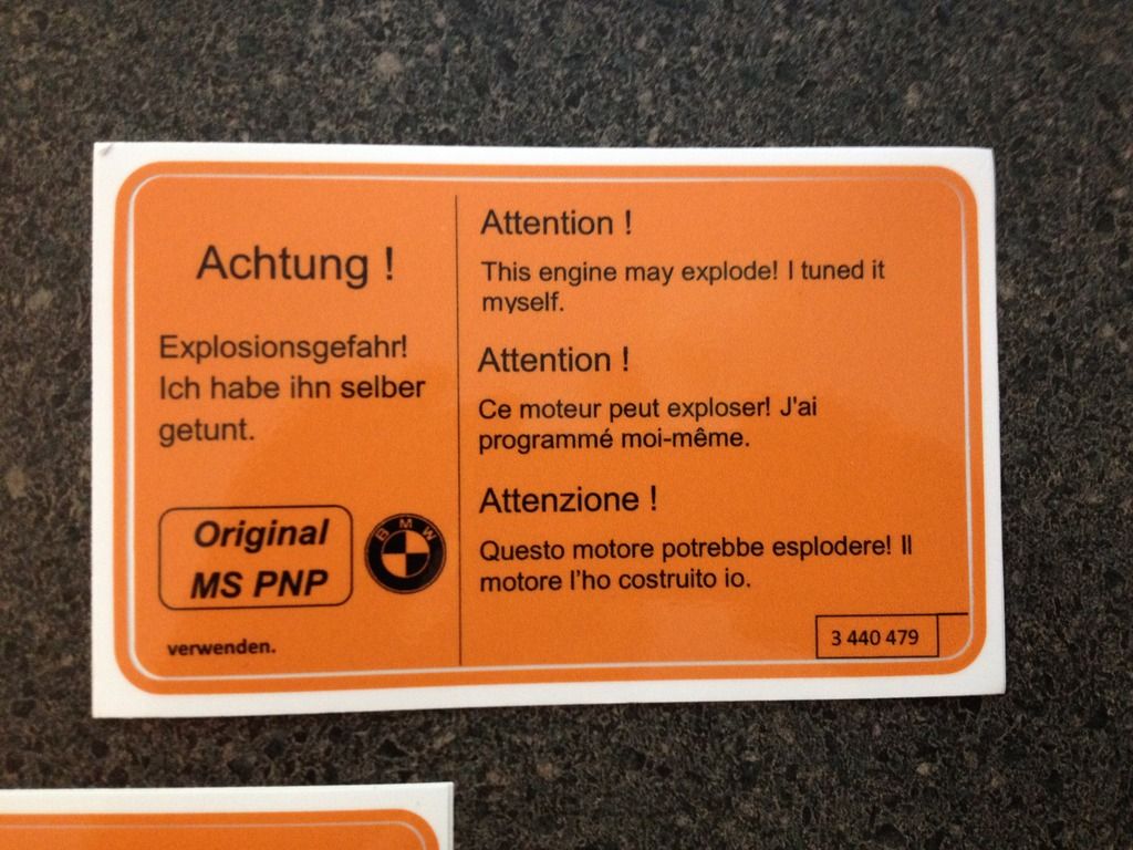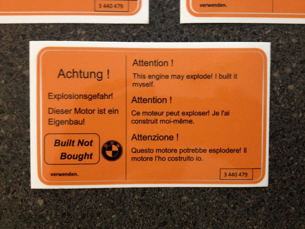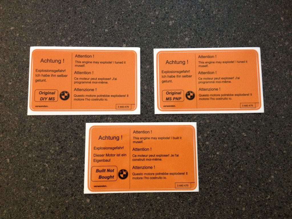 The new stickers include the original MS PNP with a better German translation and the correct OEM measurements. I also made a DIY MS sticker for those of you who built your own MS setup. The icing on the cake is the new "Built not Bought" sticker for everyone out there who has tinkered with their engines. They measure out at 120mm x 70mm and appear OEM.