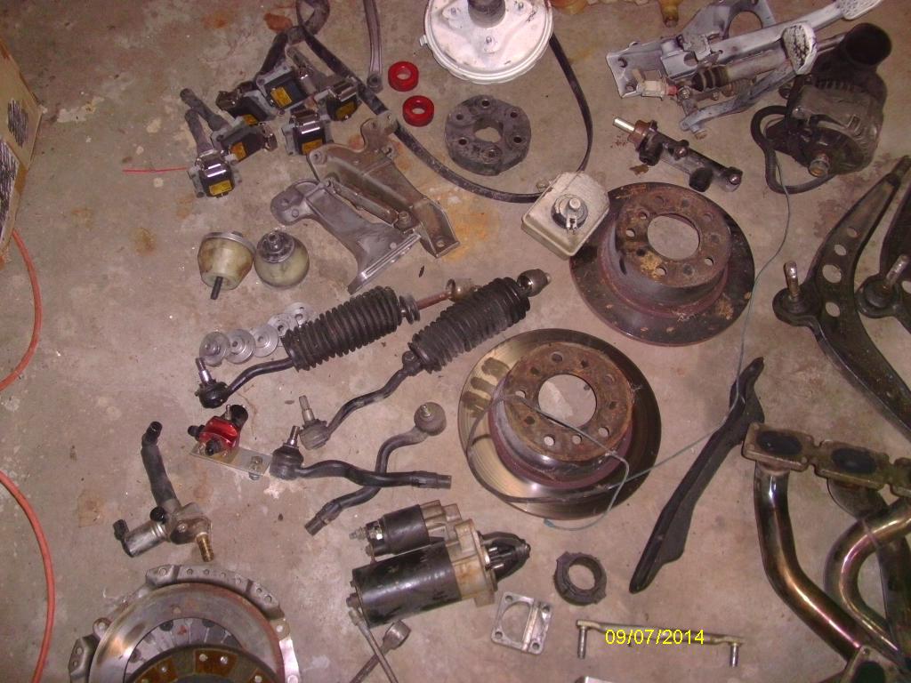 all parts are used but in reasonably good condition. partial list: radiator, expansion tank, water distribution hose to block, Rear brake rotors,starter, alternator, tie rods and steering rack, clutch and pressure plate, brake booster and master cylinder, pedal assbly,idle compensator for S50/52, fuel pressure regulator, guibo, motor mounts, headers(S50), control arms, two sets of coils(S50/52).