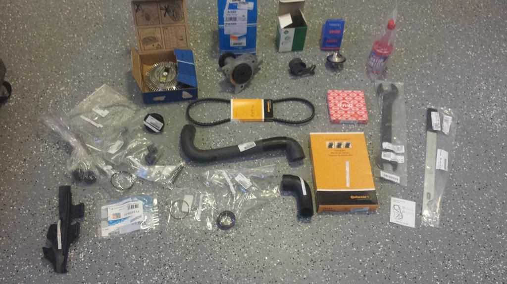 This kit includes everything necessary to replace your timing belt and water pump. I paid $405 and never got around to installing it. Includes: New Water Pump and Gasket, New Thermostat and Gasket, Fan Clutch, Radiator Mounts, Radiator Cap, Fan Clutch Tool and Counter Holder, Upper and Lower Radiator Hoses, 12 oz. Redline Water Wetter Corrosion Treatment, Timing Belt (6 Cylinder Cars), Timing Belt Tensioner and Spring (6 Cylinder Cars), Timing Belt Service Decal (6 Cylinder Cars), Cam Flange O-Ring (6 Cylinder Cars), Cam/Intermediate Shaft Seals (6 Cylinder Cars), and Front Crankshaft Seal.