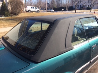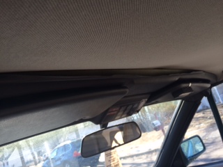 As for the interior of the top, the headliner is sagging in most places except for a couple spots here and there and the leather from the front panel is a little loose, both of which you can see in the pics. All handles are clean and solid. The window defroster works great too, this being a common downfall in most roofs with old windows.