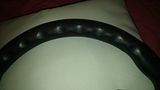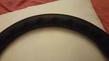 It's leather, and it's 360mm in diameter, condition is good, i'd say 8/10, it can be perfectly seen on the photos :)