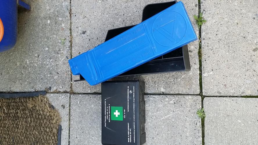 Have a trunk organizer with a triagle and first aid kit. Missing a tab that closes the kit but it's complete. everything in great condition. will post pics soon.