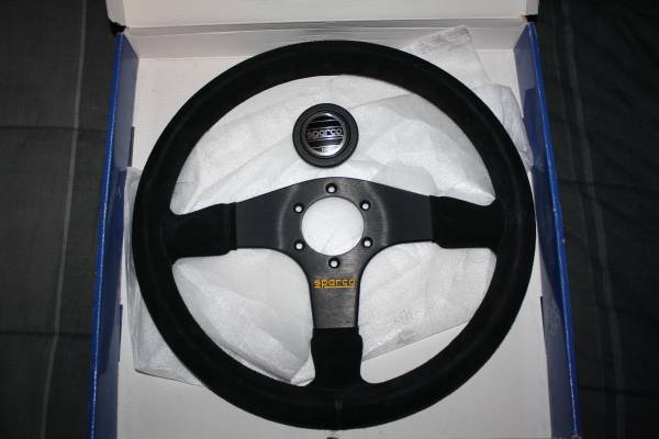 Sparco (015R375PSN) 375 Competition Black Suede Steering Wheel transcends the emotion, the excitement, and the thrill of motorsports racing. Made for competition but still comfortable and easy to grip. The steering wheel is made to be the first command in any driving maneuver. Sparco 375 steering wheel is 350mm in diameter. Many professional drivers around the world use Sparco in their race cars. Sparco has been around for more than 20 years providing various drivers with quality equipment. Brand New Still in the box, Summit offers these for $250 plus shipping.