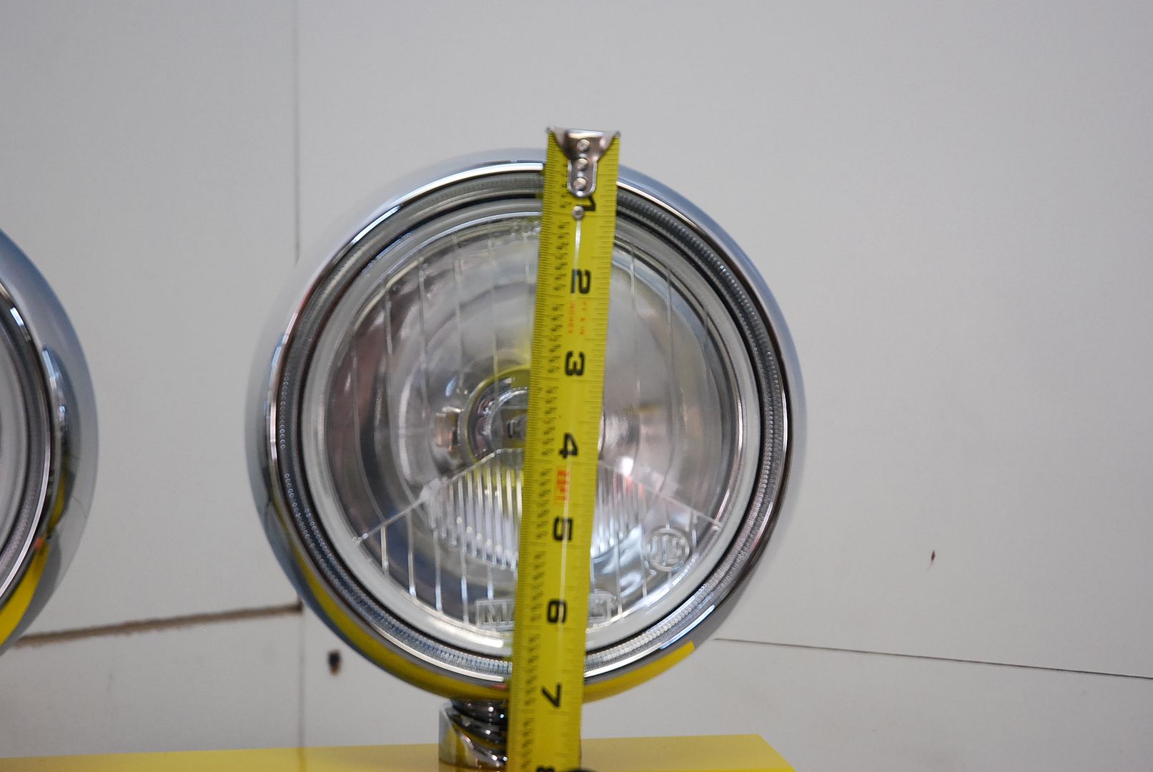 The smaller (chrome round-back housing) Super Oscar/Oscar SC replicas: These are a driving light lens – for distance with a mild amount of spread, unlike a narrow pencil or spot distance beam. The housing is 7” in diameter (unlike the true Super Oscar, which was over 8” diameter so it is more like the Oscar SC in size). The glass lens itself is 5 1/2” diameter. The Oscar SC was only available in a non-fluted spot/pencil beam light, which isn't that great on the road where you need some spread or width of beam, as these driving lenses have. The chrome quality on these lights is great. These lights can be mounted upside down as well, with the same beam pattern.