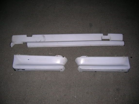 three piece is rear valence. intended for 318is (as far as i can tell), came off of a 325, there are two notches cut to make it fit, but when its mounted, you can't see them, also, the exhaust cutout was widened to make room for second tailpipe, still looks good. some nicks and chips. white. pics in an hour or so. i've got my fingers crossed for 75, make an offer.
