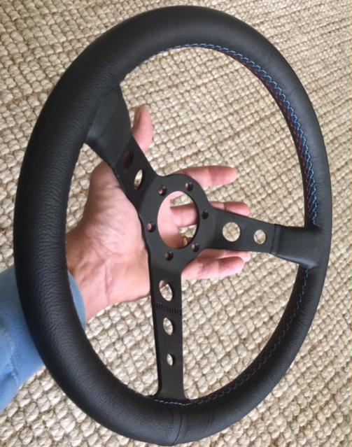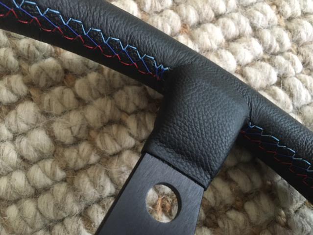 I love how the Alcantara makes the tri color thread really pop. Here on an e46 zhp wheel.