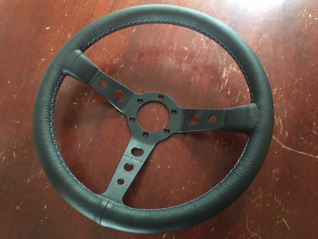 I sent Jordan a Momo Mod07, which is a dished 3 spoke wheel that has a yellow stripe and is typically alcantara. And I asked him to wrap it like a Prototipo (horizontal spokes have 1/3 wrap, bottom spoke has no wrap) with motorsport stitching. Here is the result. Can't wait to install it...