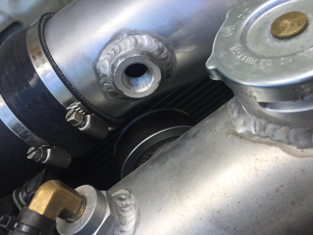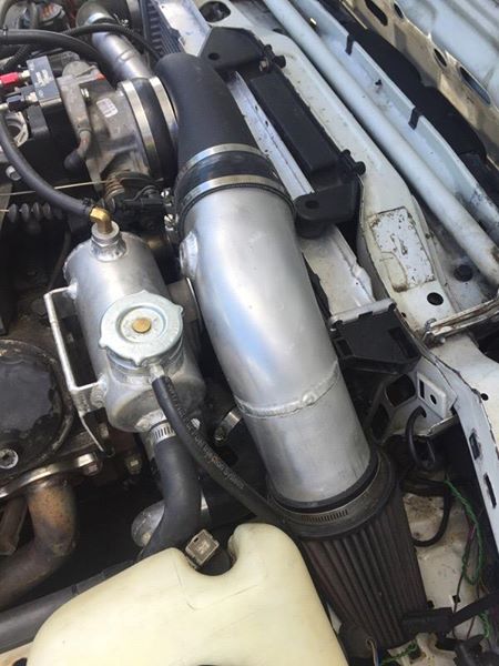 Intake pipe with tight elbow off the throttle body. Fit with the stock radiator in place. Complete with air filter. 3/8npt bung for GM air temp sensor. Pipe has been massaged to clear the tensioner pulley.