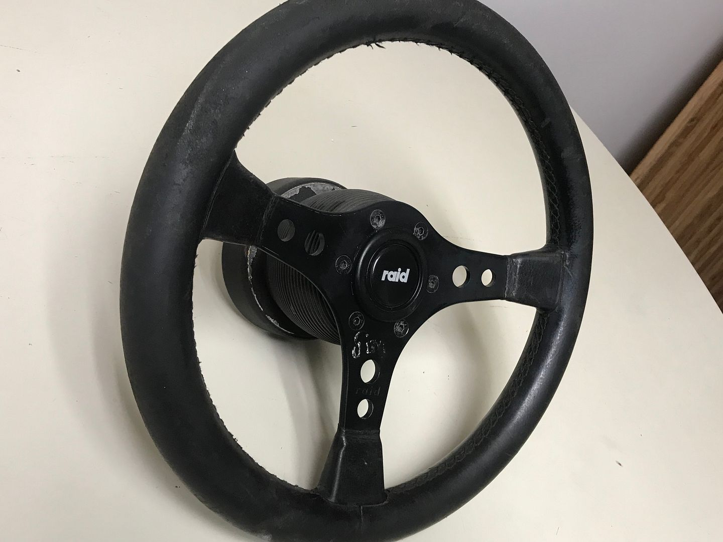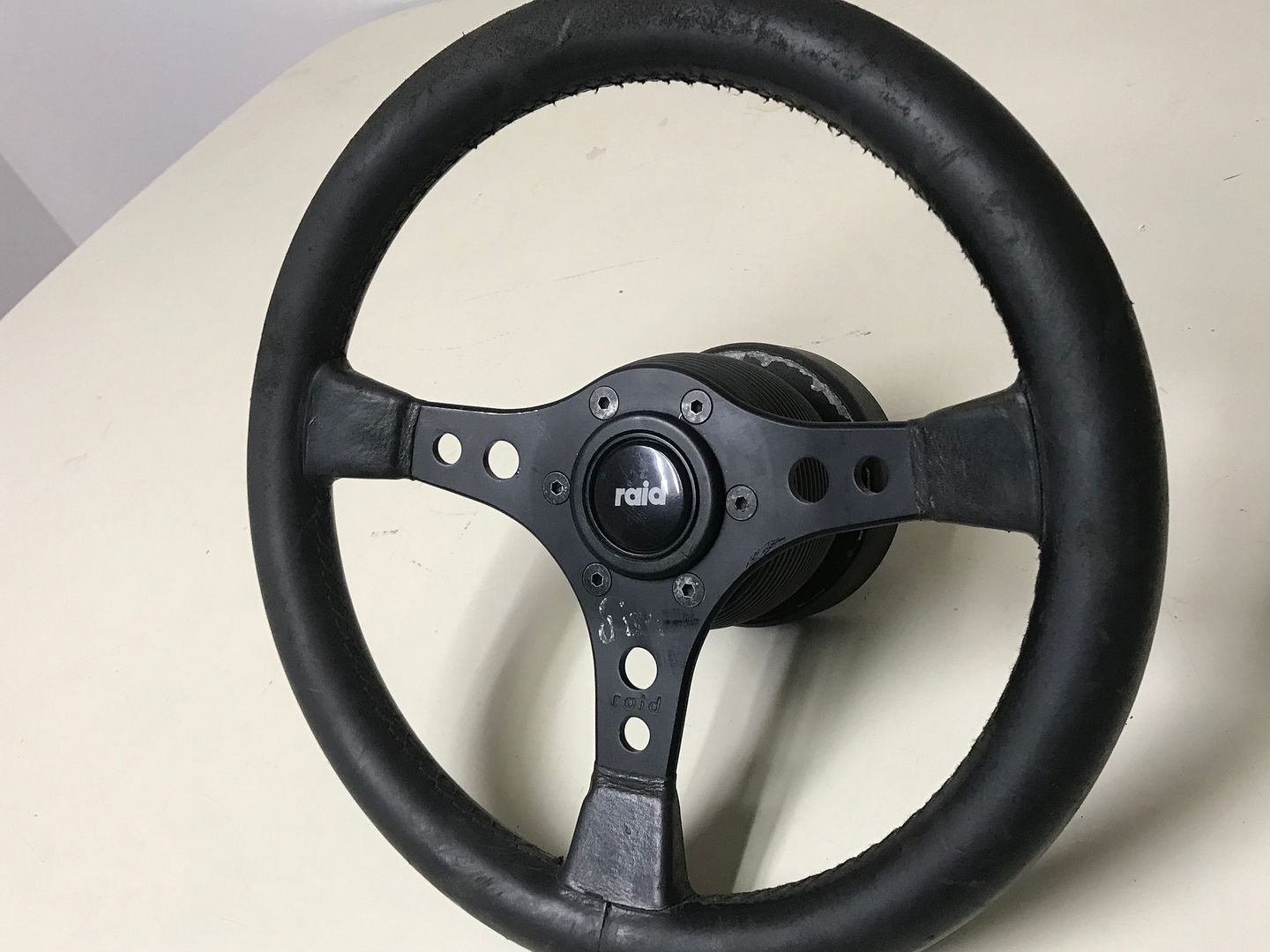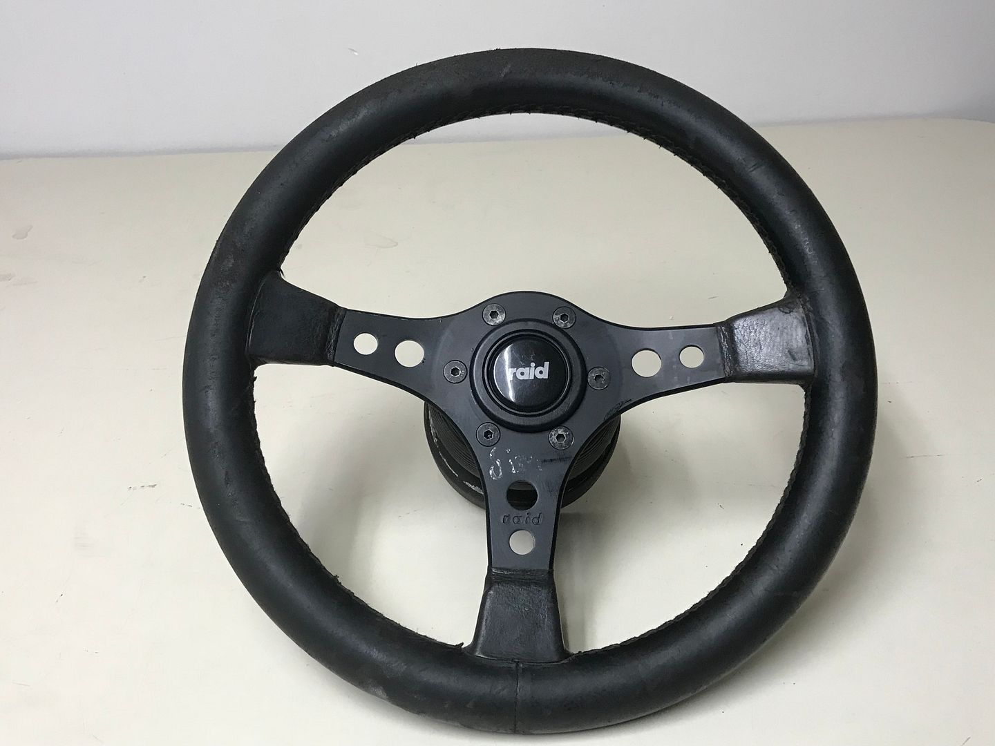 The Raid steering wheel is also from an e30, the leather is warn and will need to be replaced at some point but has no tears. It comes with the hub adapter and the horn pad. Price is $100 + shipping.